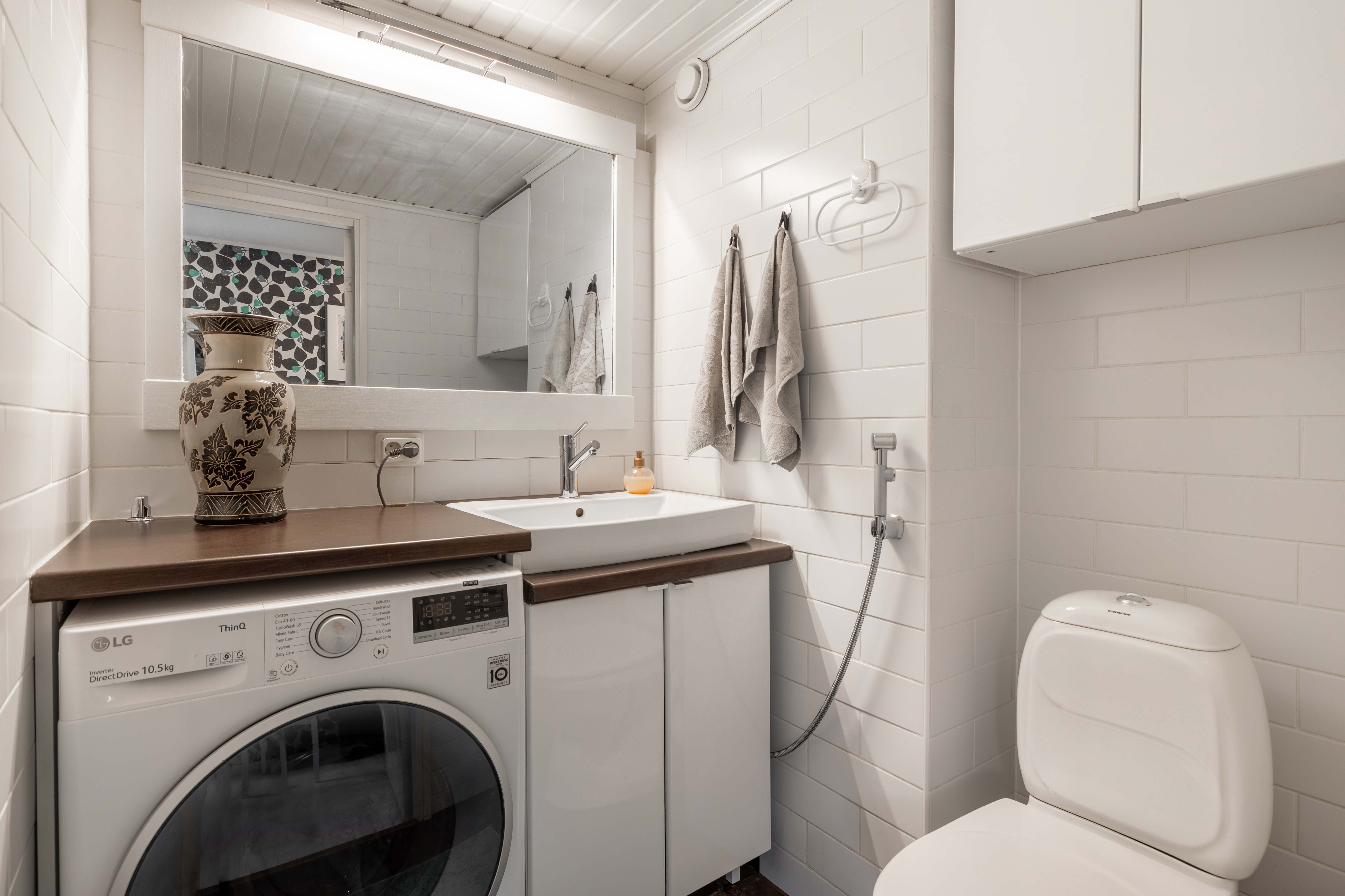 Lukumäärä: 1, WC-istuin, bidee-suihku, pesukoneliitäntä, peili ja allaskaappi, seinät (Kaakeli), lattiat (Laatta) |