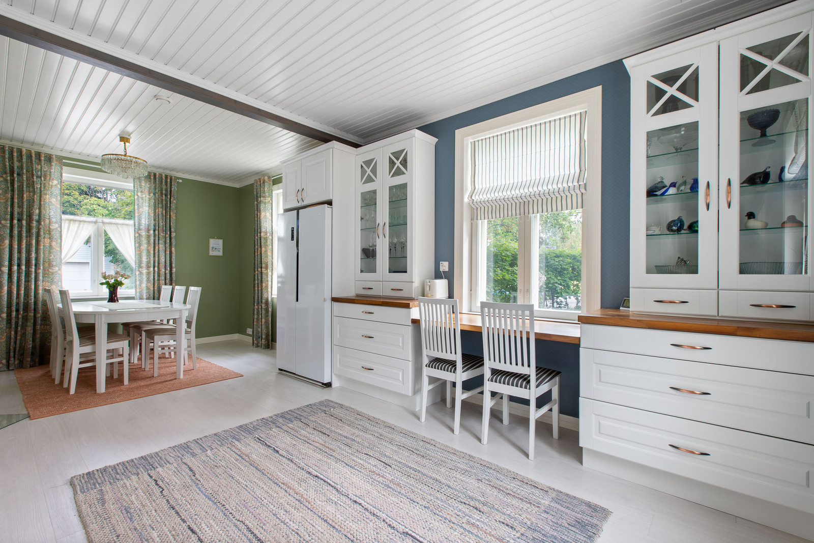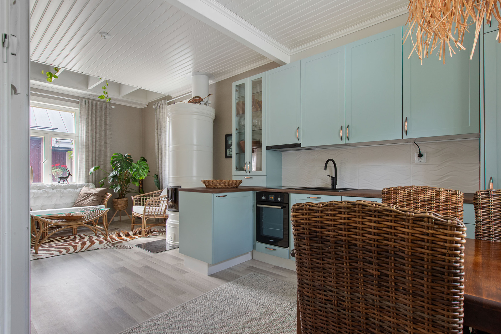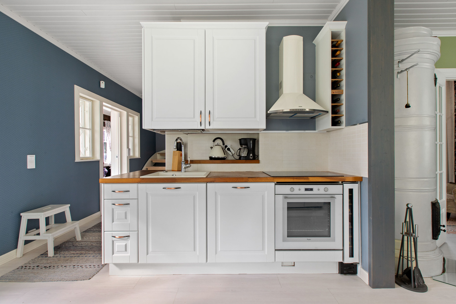 | Keittiön kuvaus | Liesi (liesitaso, erillisuuni), työtasot (puu), seinät (maali ja tapetti), lattiat (vinyylikorkki), erillisuuni, mikroaaltouuni, erillinen pakastin, astianpesukone, jääkaappi ja liesitaso, liesituuletin / hormi, viinikaappi, kiinteät valaisimet |