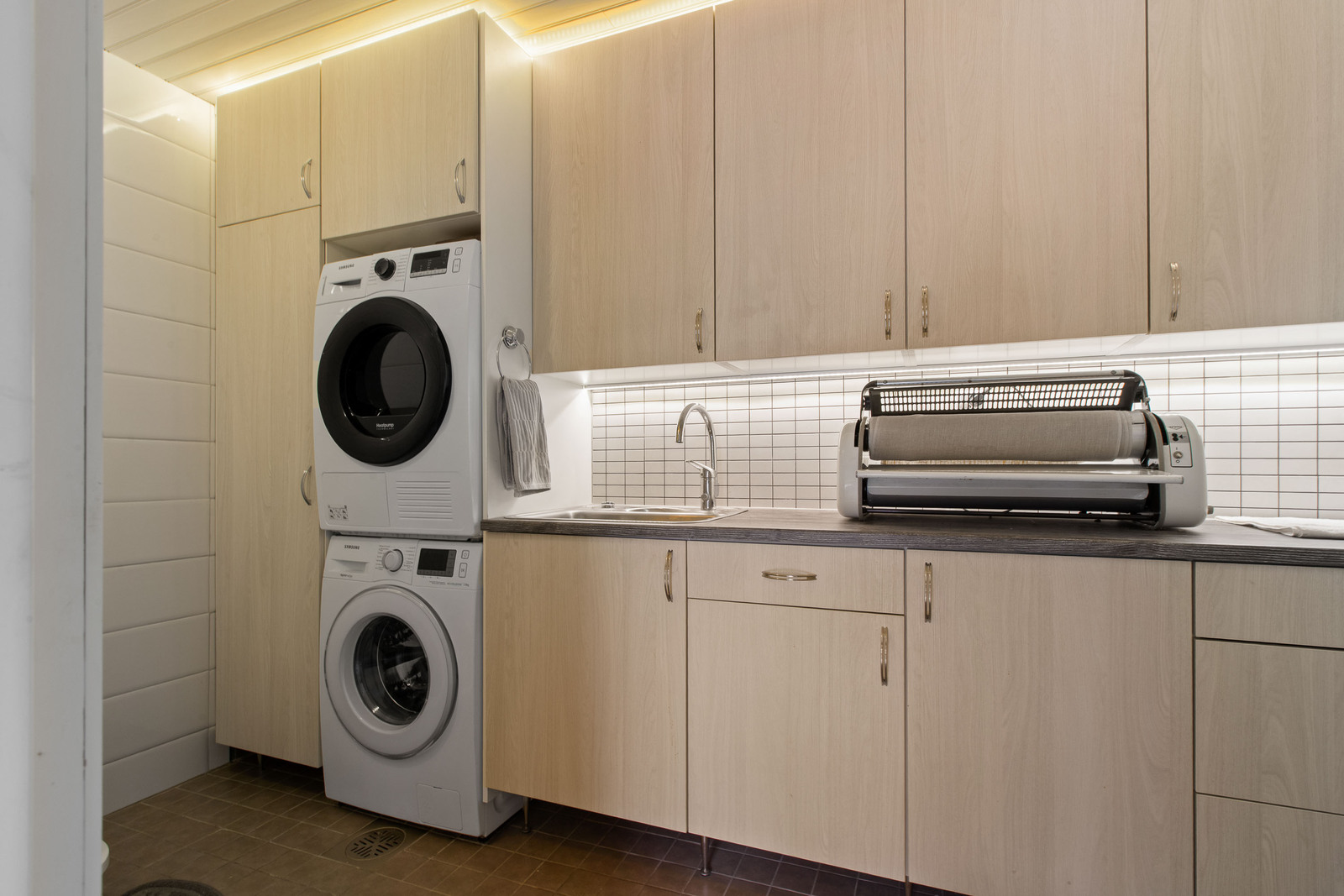 | Kodinhoitohuoneen kuvaus | Pesukone, kuivausrumpu, lattiakaivo ja lattialämmitys, lattiat (laatta), seinät (kaakeli), vanhan rakennuksen khh on myös wc ja valmius suihkulle |