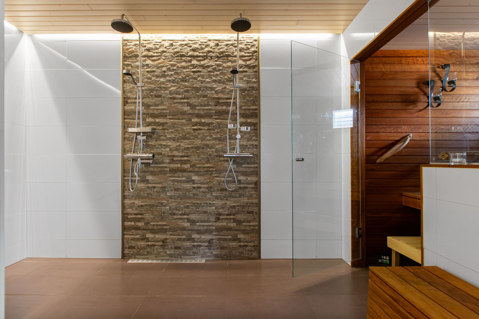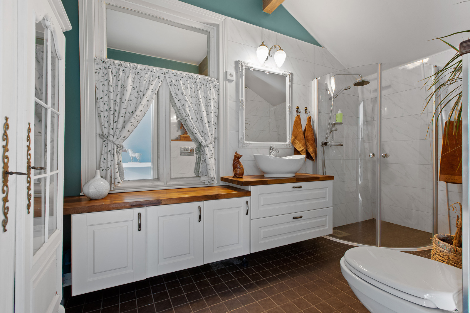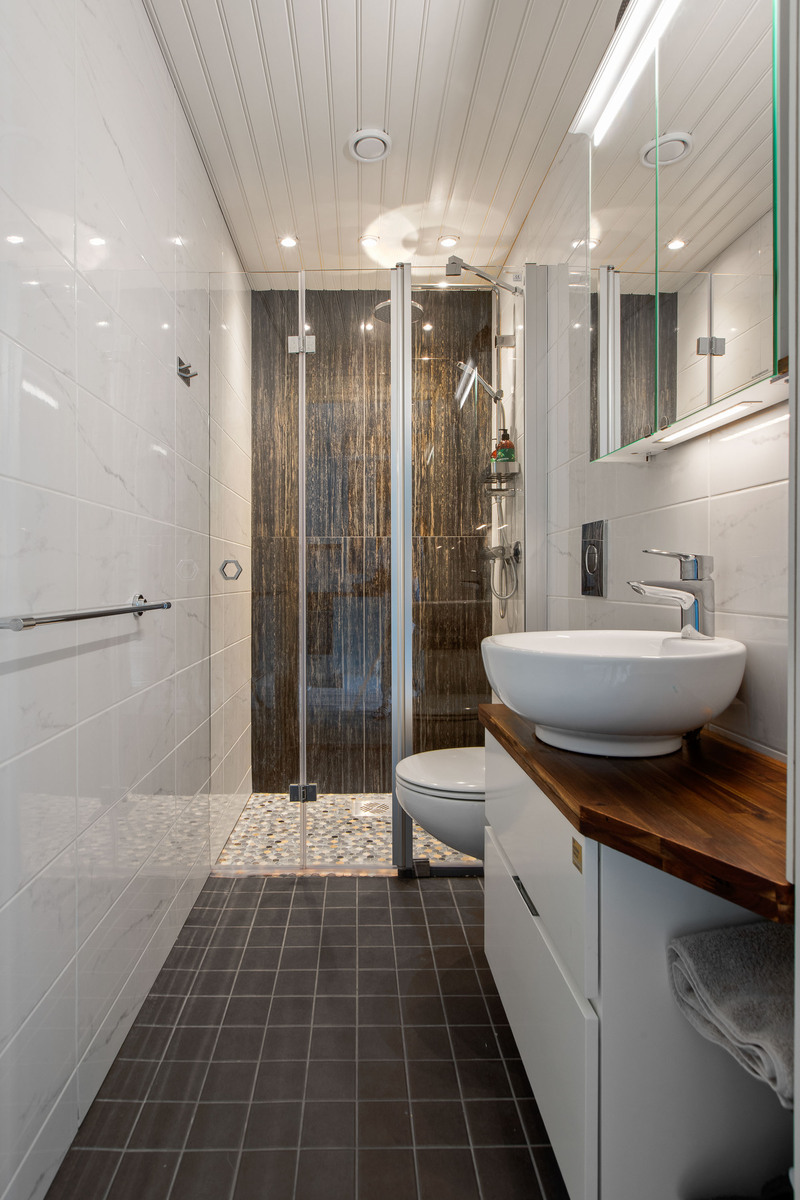 | Kylpyhuoneen kuvaus | Suihkuseinä, lattialämmitys, suihku, wc-istuin, peili, allaskaappi ja kiinteät valaisimet, asennettuja erikoisvarusteita, seinät (kaakeli), lattiat (laatta) |