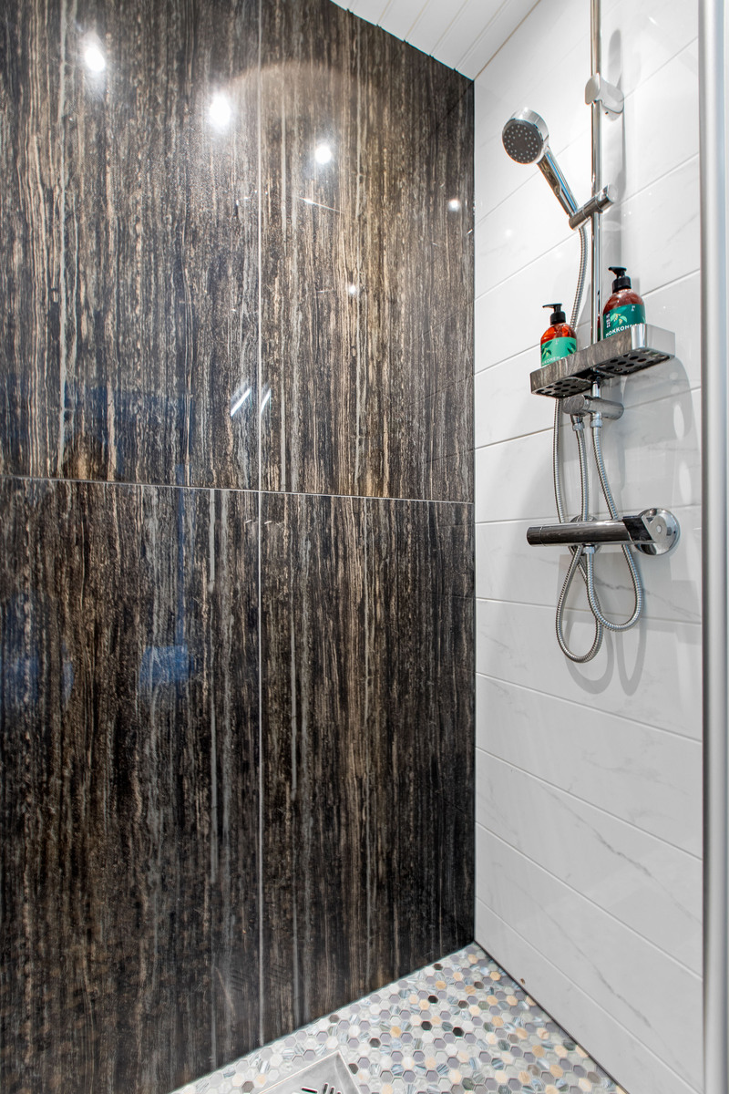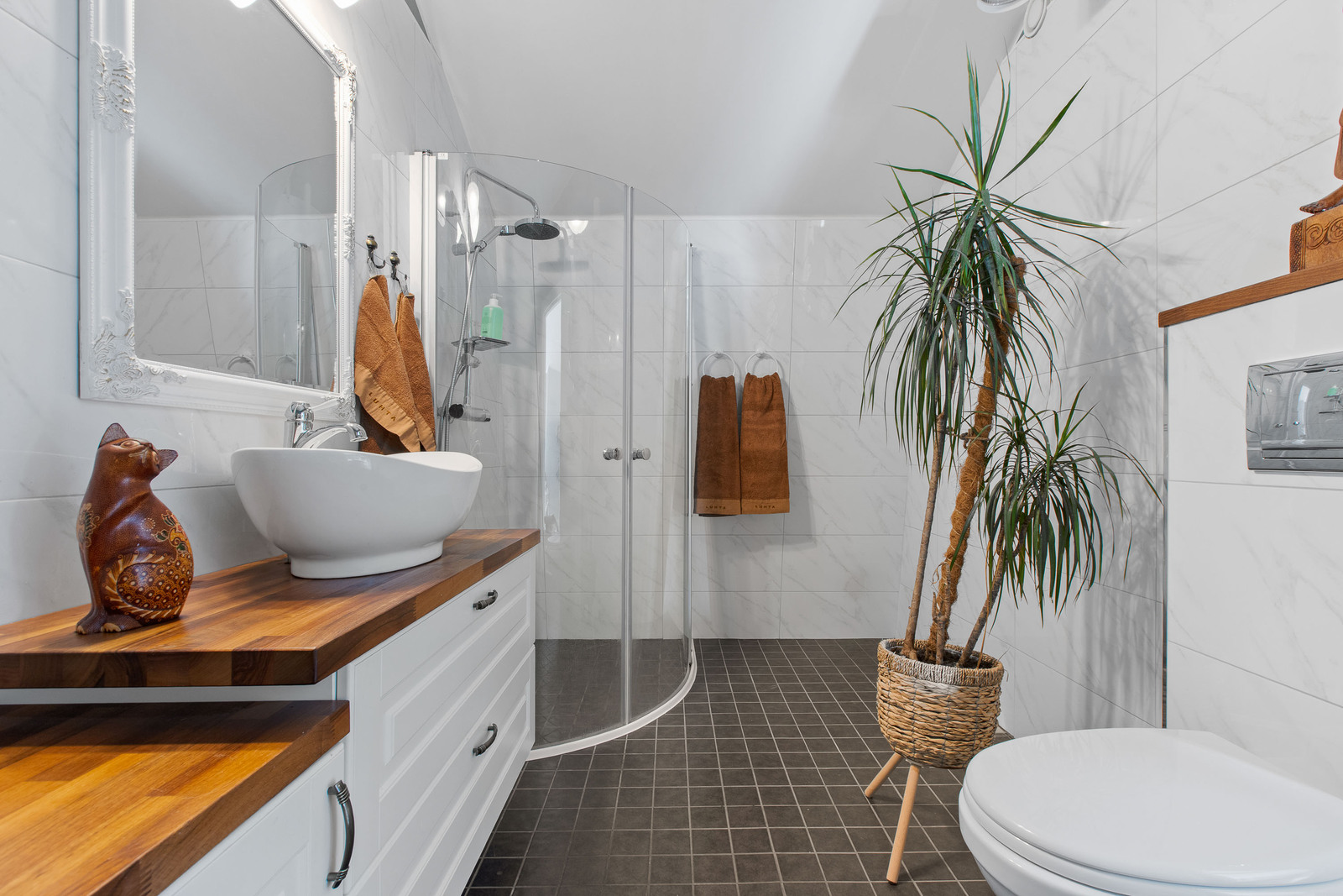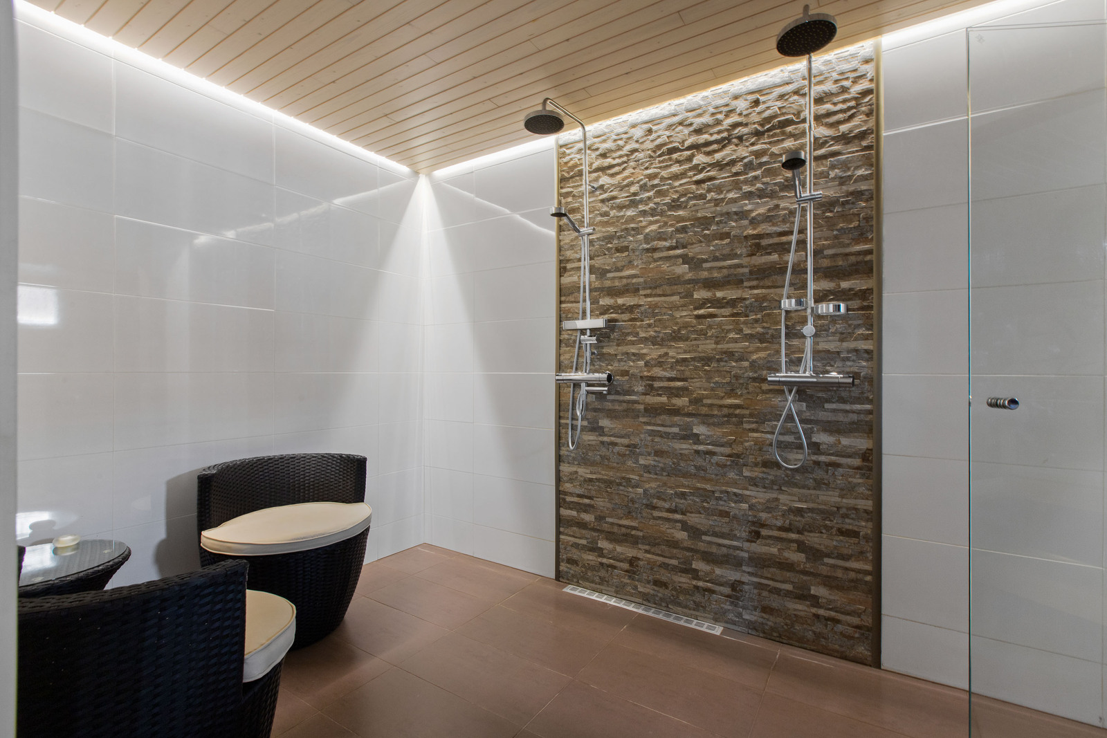 | Kylpyhuoneen kuvaus | Suihkuseinä, lattialämmitys, suihku, wc-istuin, peili, allaskaappi ja kiinteät valaisimet, asennettuja erikoisvarusteita, seinät (kaakeli), lattiat (laatta) |
