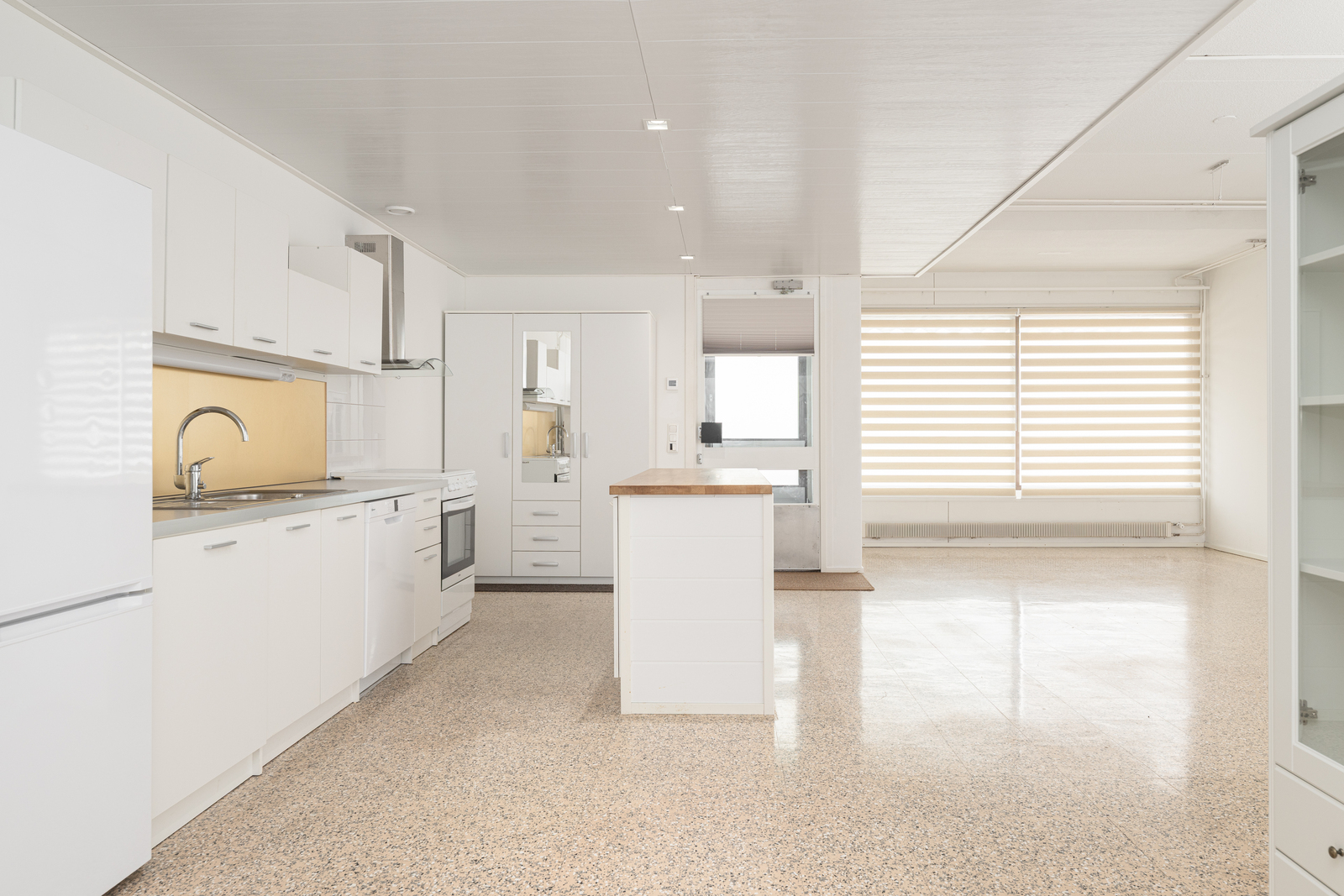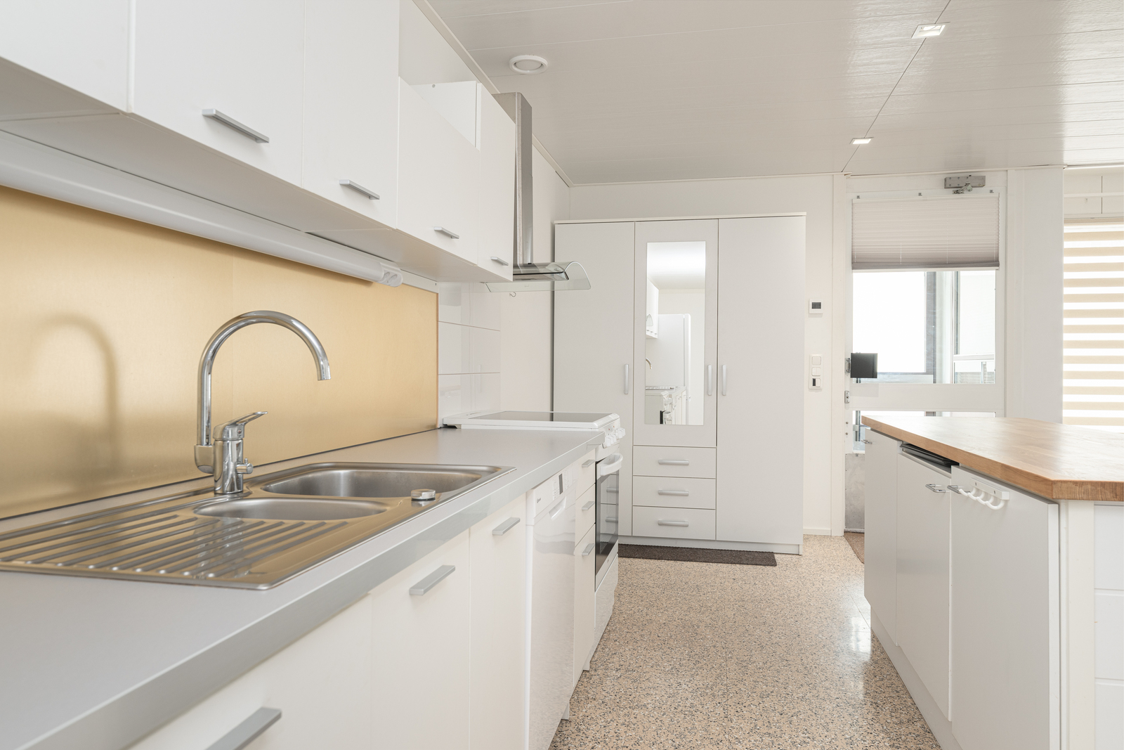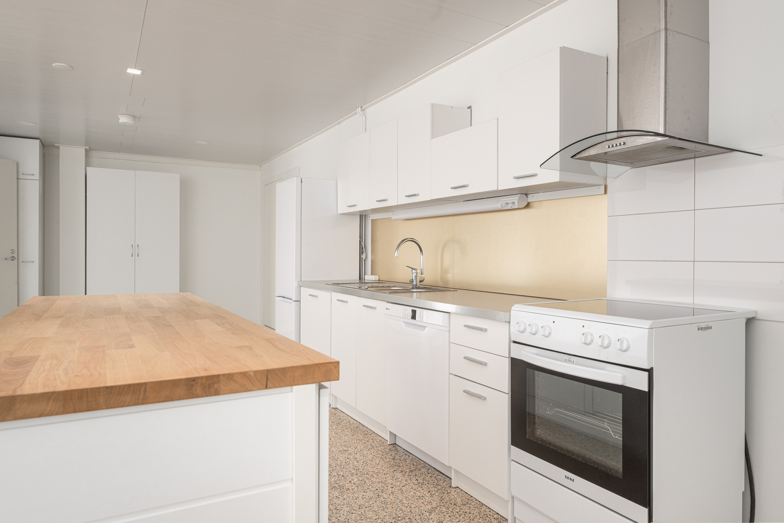 | Keittiön kuvaus | Liesi (Keraaminen liesi), seinät (maali), lattiat (betoni), liesituuletin, jääkaappipakastin, astianpesukone ja kiinteät valaisimet, Keittiö on uutta vastaavassa kunnossa. Välitilassa roiskesuojan levy. |