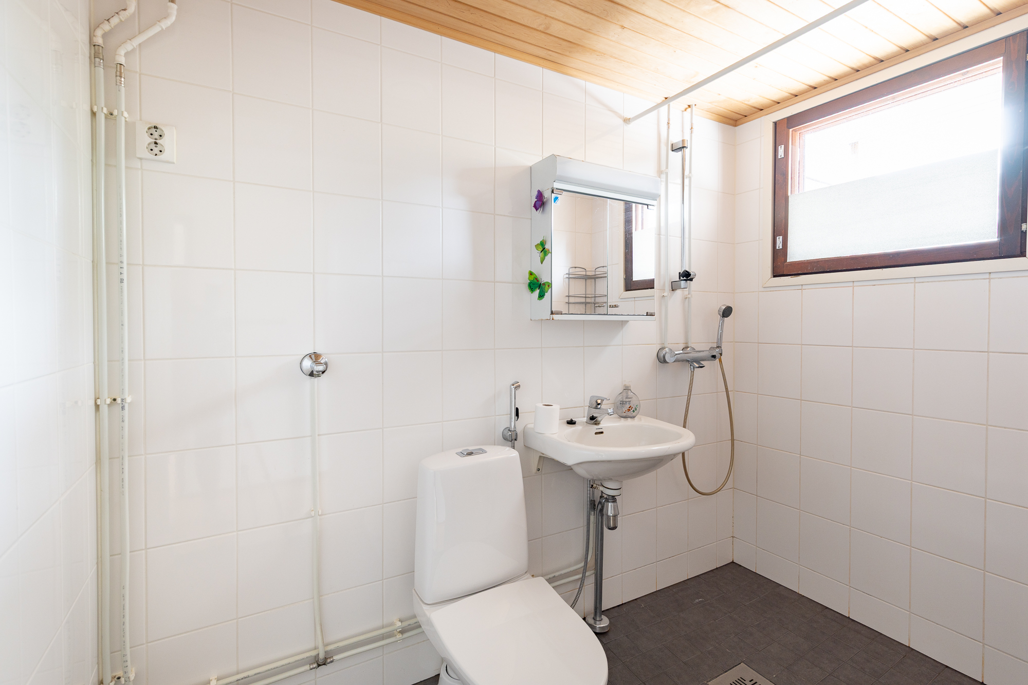| Kylpyhuoneen kuvaus | Pesukoneliitäntä, wc-istuin, suihku, peilikaappi ja kiinteät valaisimet, seinät (kaakeli), lattiat (laatta) |