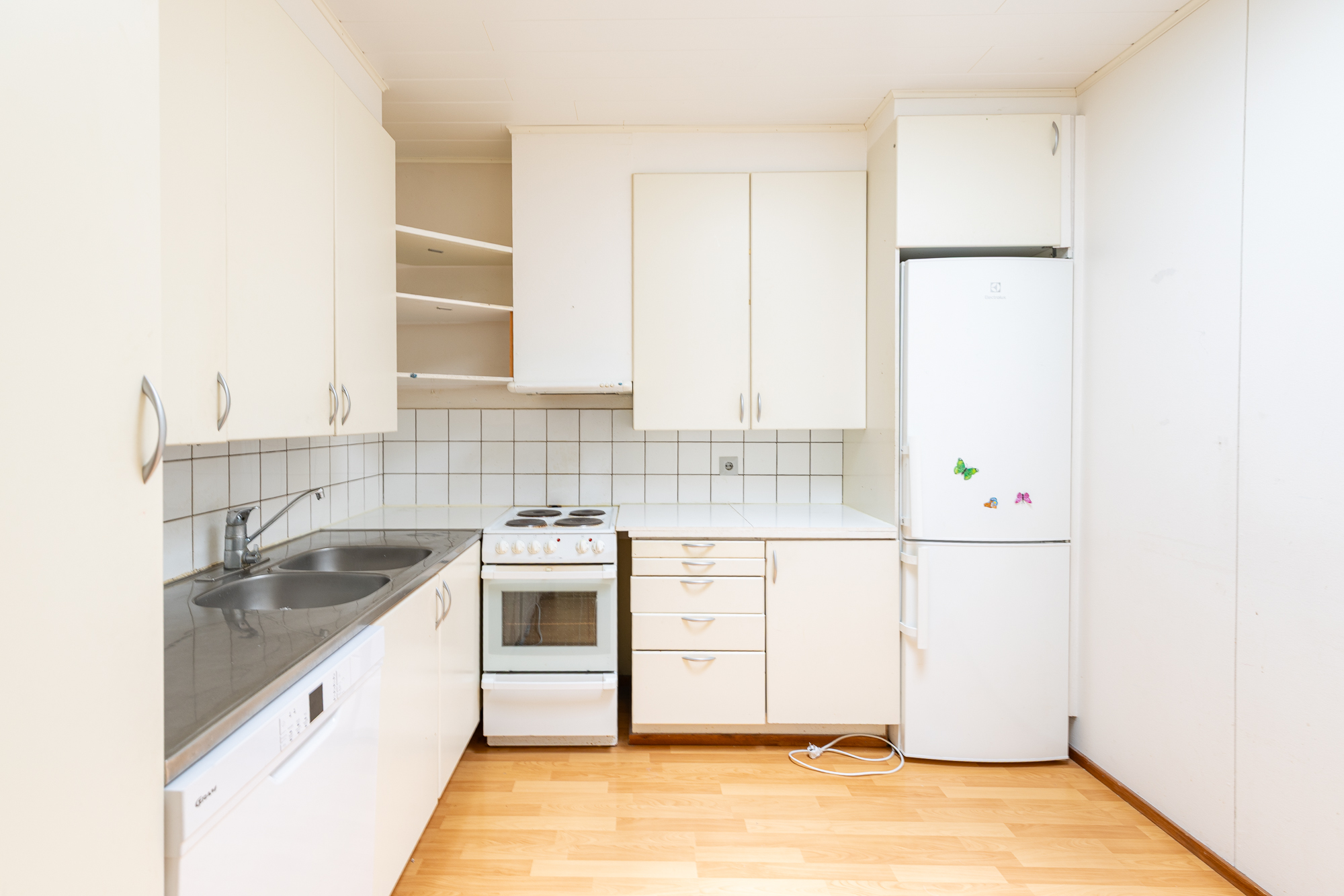 | Keittiön kuvaus | Liesi (Sähköhella), työtasot (laminaatti), seinät (maali), lattiat (laminaatti), jääkaappipakastin, liesi, liesituuletin ja astianpesukone |