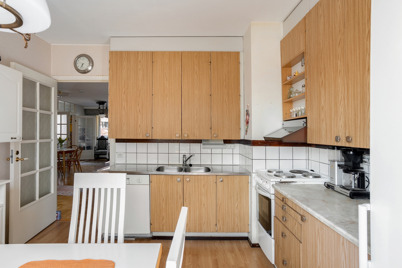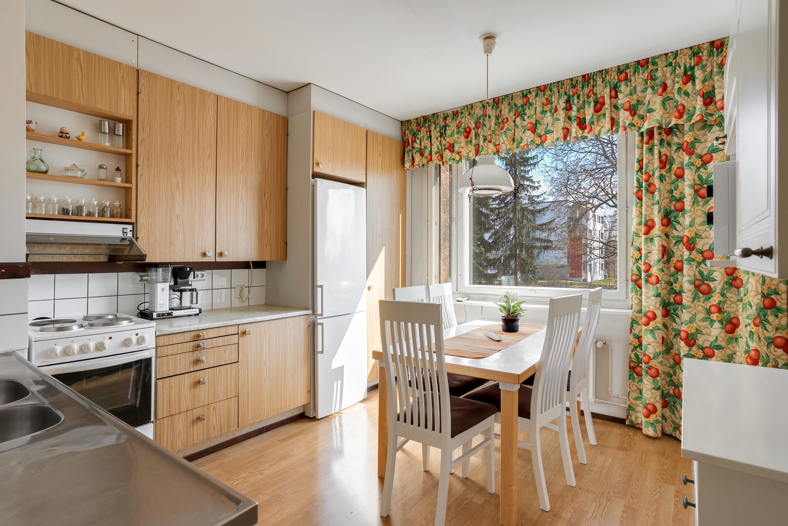 | Keittiön kuvaus | Liesi (sähköliesi), työtasot (laminaatti), seinät (tapetti), lattiat (laminaatti), liesituuletin (liesikupu), jääkaappipakastin, astianpesukone, liesi ja kiinteät valaisimet |