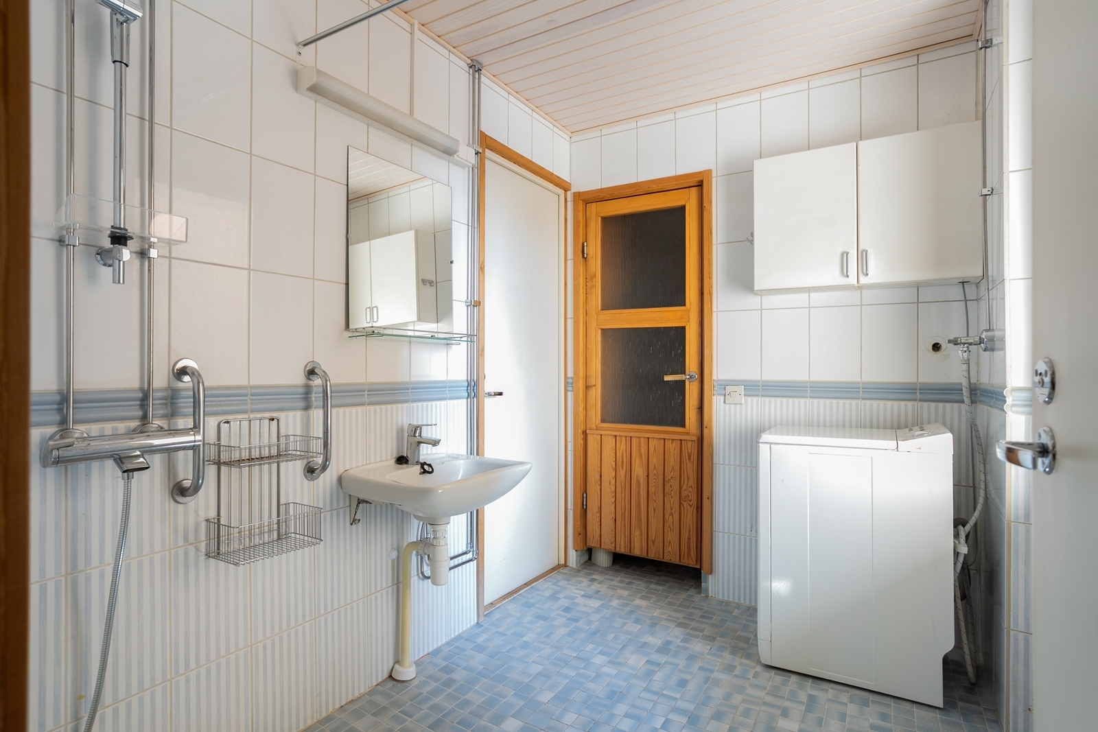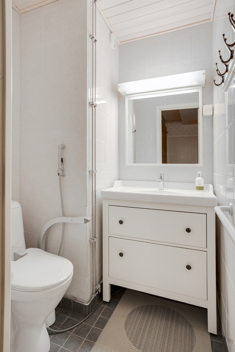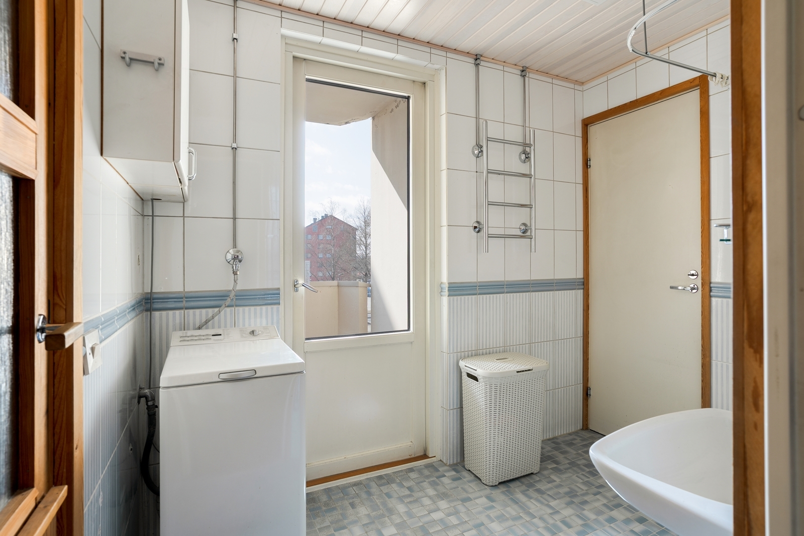| Kylpyhuoneen kuvaus | Pesukoneliitäntä, suihku, peili, lattialämmitys ja kiinteät valaisimet, seinät (kaakeli), lattiat (laatta) |