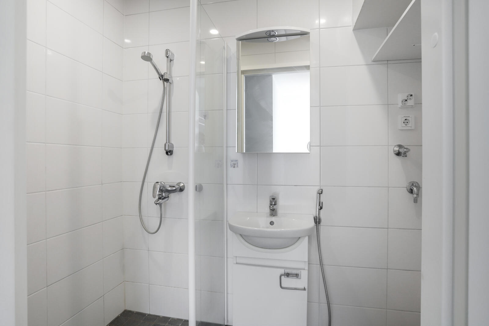 | Kylpyhuoneen kuvaus | Pesukoneliitäntä, lattialämmitys, suihkuseinä, peilikaappi, suihku, wc-istuin ja kiinteät valaisimet, seinät (kaakeli), lattiat (laatta) |