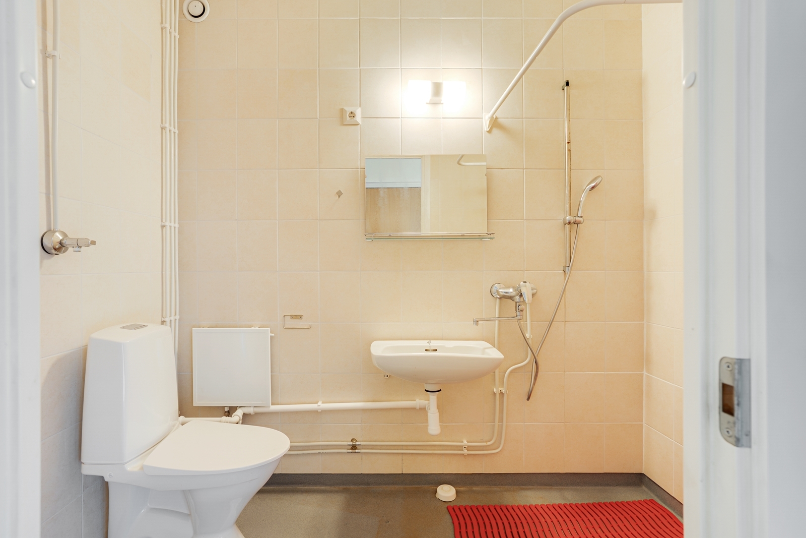 | Kylpyhuoneen kuvaus | Suihku, peili, wc-istuin, pesukoneliitäntä ja kiinteät valaisimet, seinät (kaakeli), lattiat (muovimatto) |