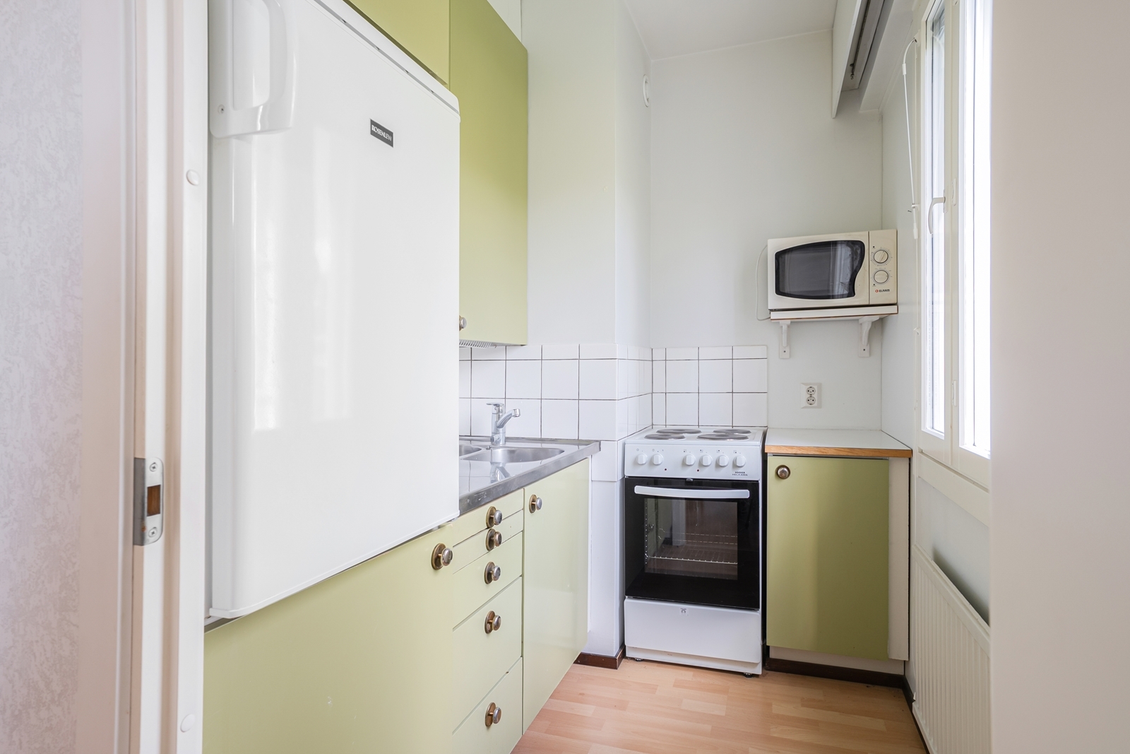 | Keittiön kuvaus | Liesi (sähköliesi), työtasot (laminaatti), seinät (maali), lattiat (laminaatti), liesi, jääkaappi, mikroaaltouuni ja kiinteät valaisimet |