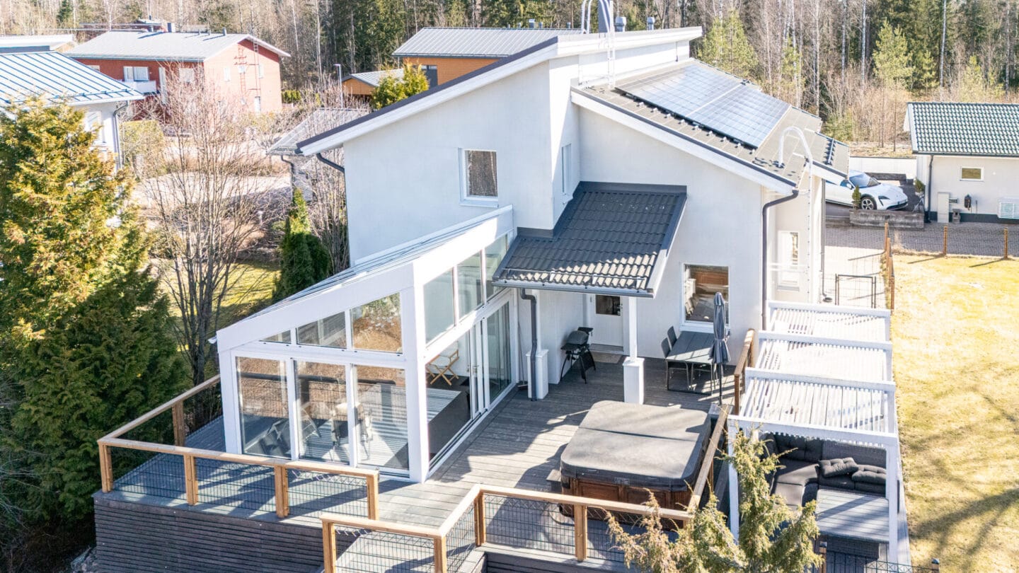 Terassin poreallas, verhotangot, sälekaihtimet, kiinteät valaisimet, pyyhe- ym koukut. Sähköauton latausasema. Aurinkopaneelit.