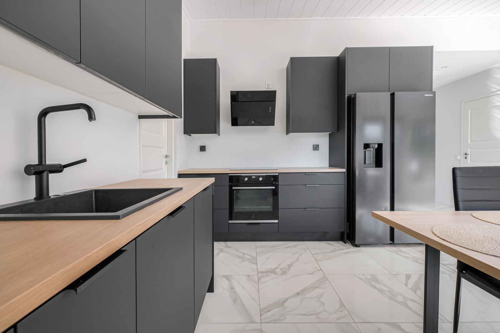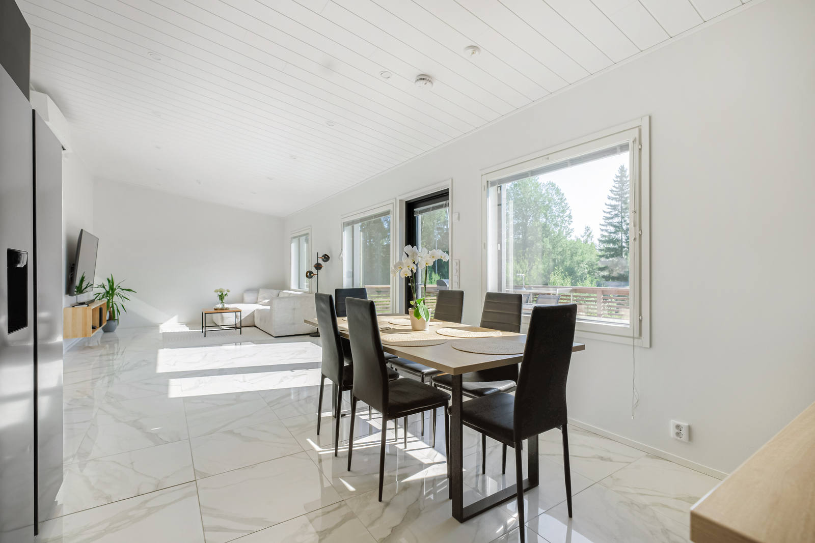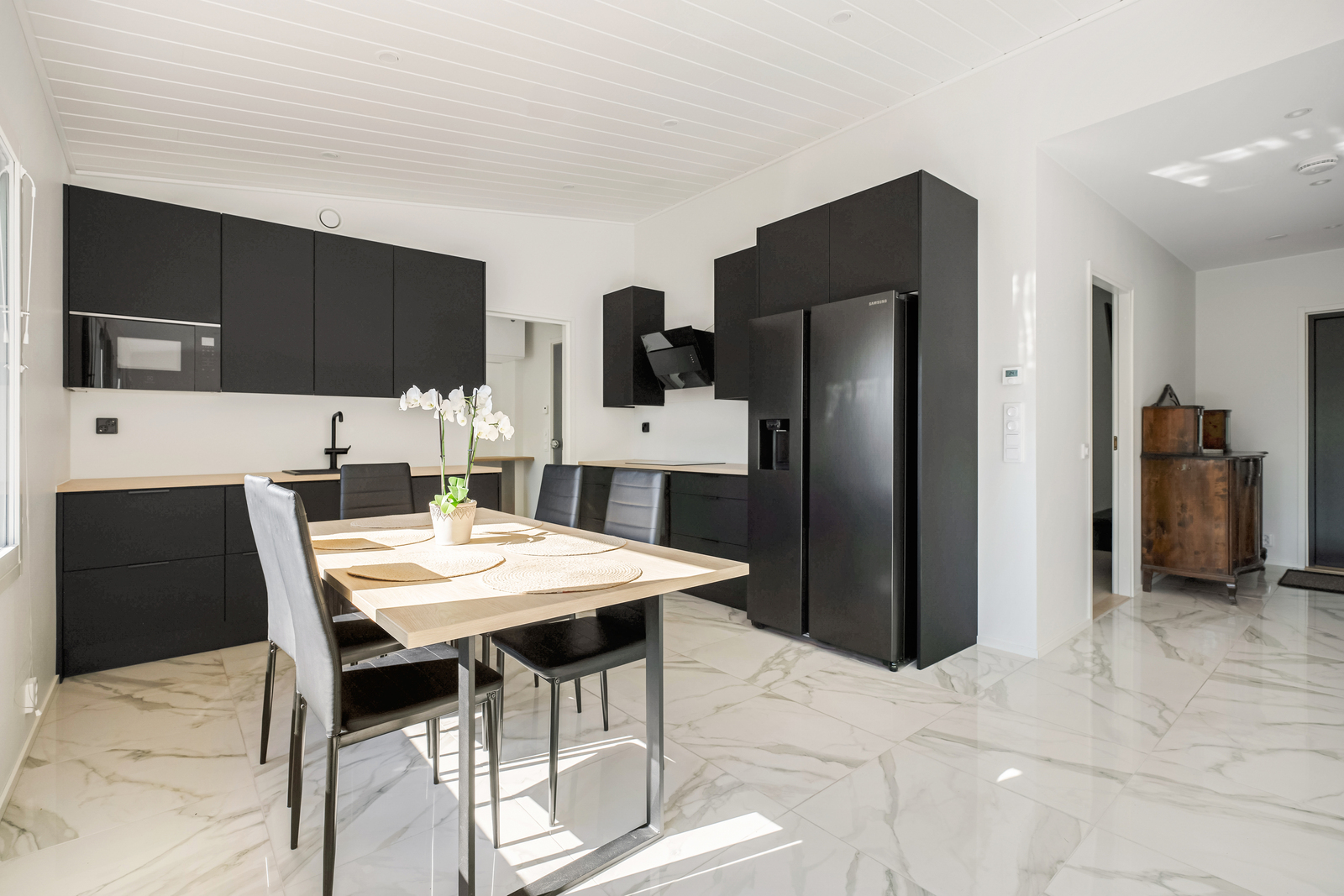 Kodissa yhdistyvät moderni tyyli ja käytännölliset ratkaisut. Avoin keittiö ja olohuone muodostavat yhtenäisen, valoisan tilan, jossa on helppo viettää aikaa yhdessä. Suuret ikkunat tuovat runsaasti luonnonvaloa ja luovat avaran tunnelman koko kotiin. Keittiössä tummat sävyt ja valkoinen marmorilaatta muodostavat tyylikkään ja tasapainoisen kokonaisuuden.