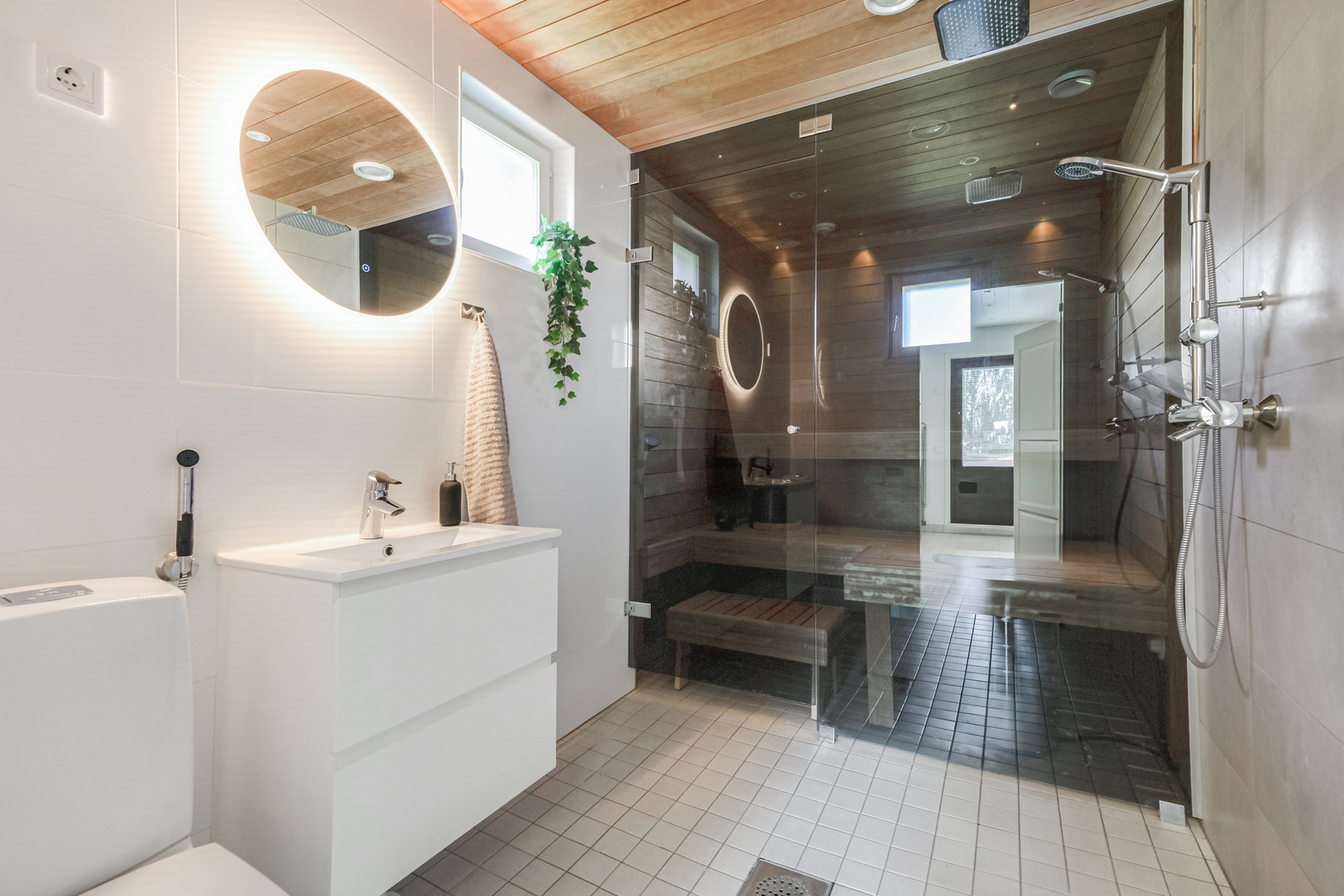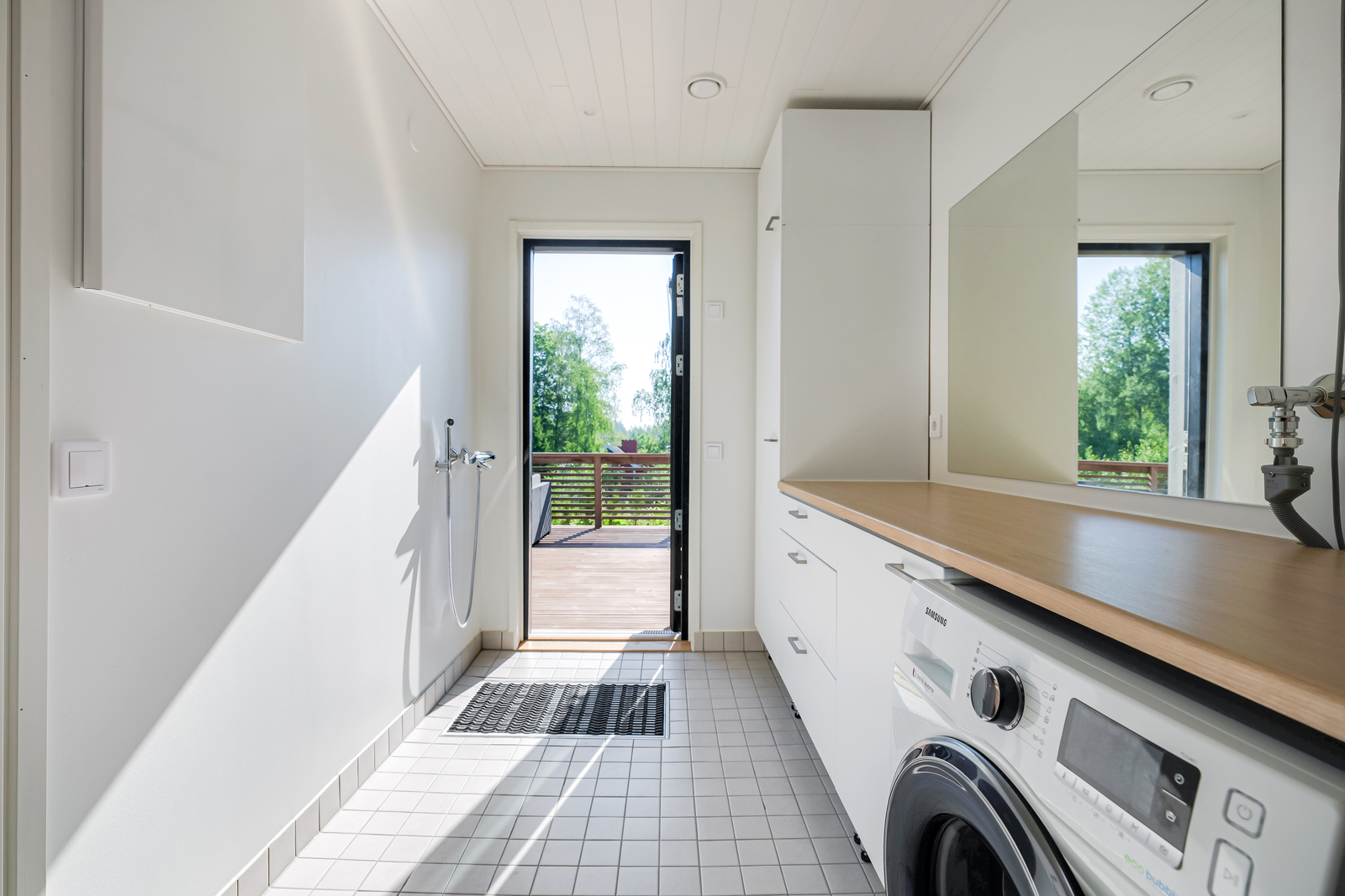 Kodinhoitohuoneesta on suora kulku kylpyhuoneeseen ja omaan saunaan. Löylyjen jälkeen voit siirtyä vilvoittelemaan suoraan omalle terassille – ihanteellinen paikka rentoutumiseen. Asunnon yhteydessä on myös oma autotalli, joka tarjoaa turvallisen säilytystilan autolle tai lisävarastoksi.