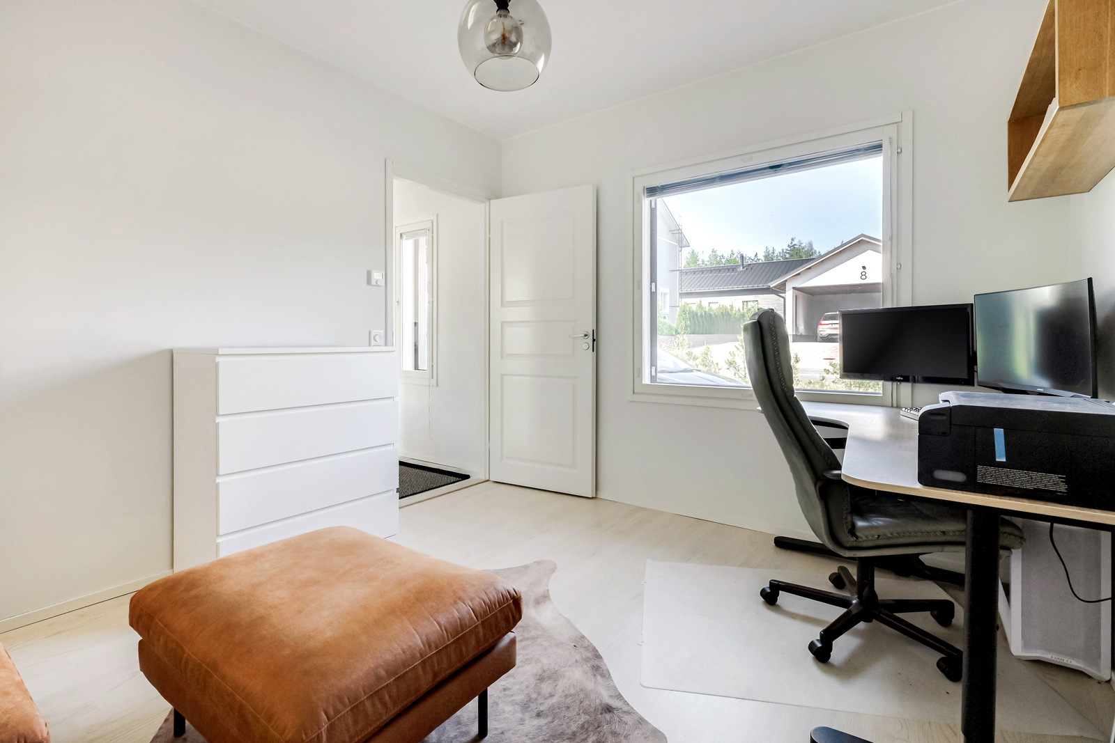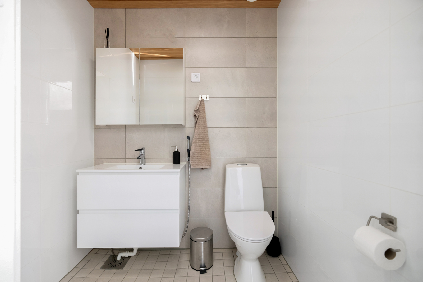 Asunnossa on kaksi makuuhuonetta, joista toinen sopii mainiosti myös työhuoneeksi tai lastenhuoneeksi – tarpeidesi mukaan. Erillinen wc lisää arjen mukavuutta, ja käytännöllinen kodinhoitohuone tuo lisää säilytystilaa ja mahdollisuuden toimivaan arjen pyörittämiseen.