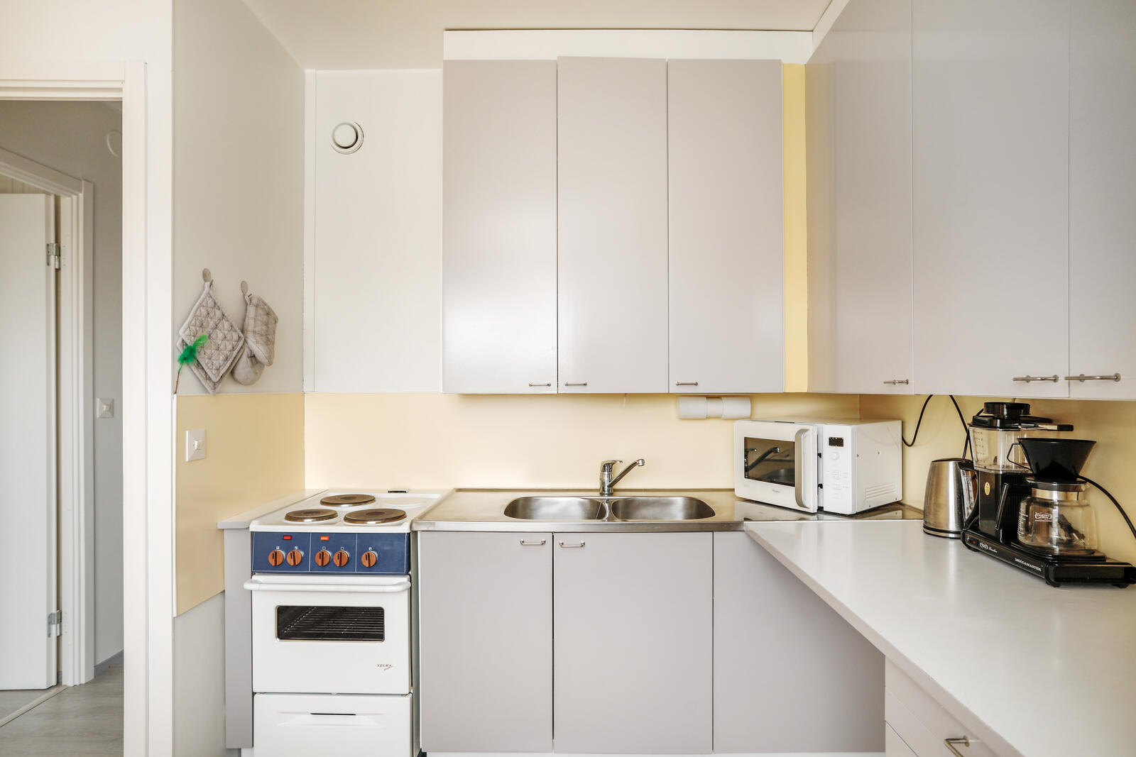 | Keittiön kuvaus | Liesi (sähköliesi), seinät (maali), lattiat (laminaatti), liesi, jääkaappipakastin ja kiinteät valaisimet |