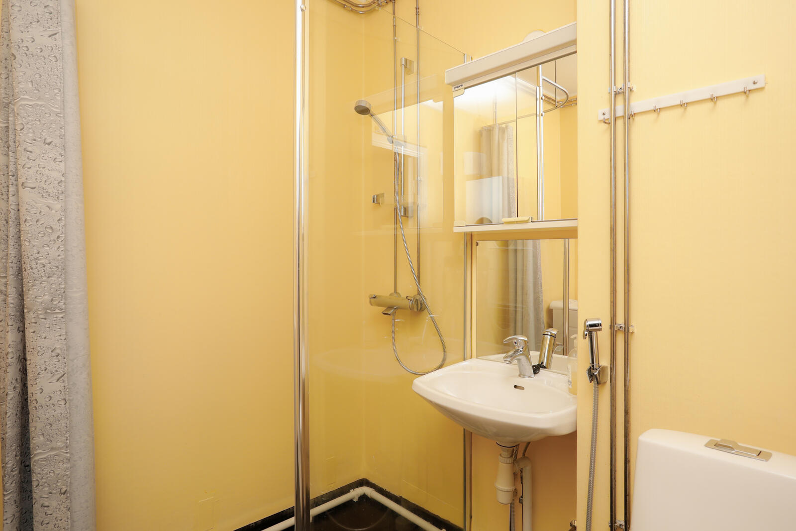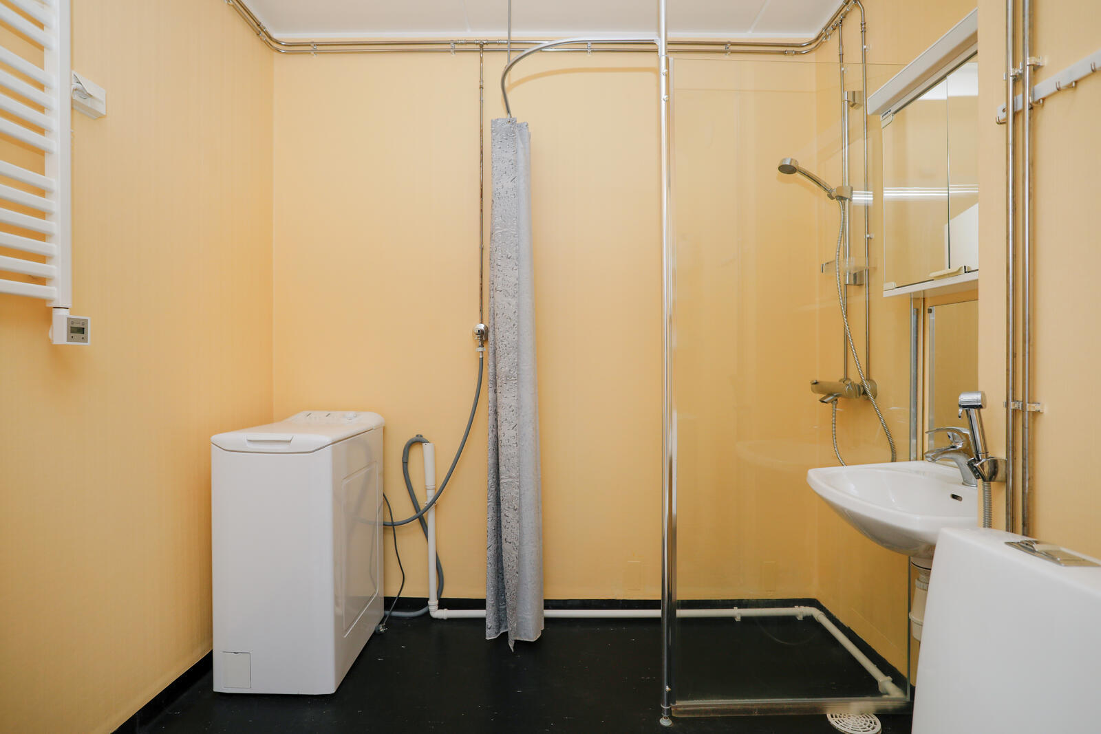 | Kylpyhuoneen kuvaus | Suihku, wc-istuin, peilikaappi, pesukoneliitäntä ja kiinteät valaisimet, seinät (muovimatto), lattiat (muovimatto) |