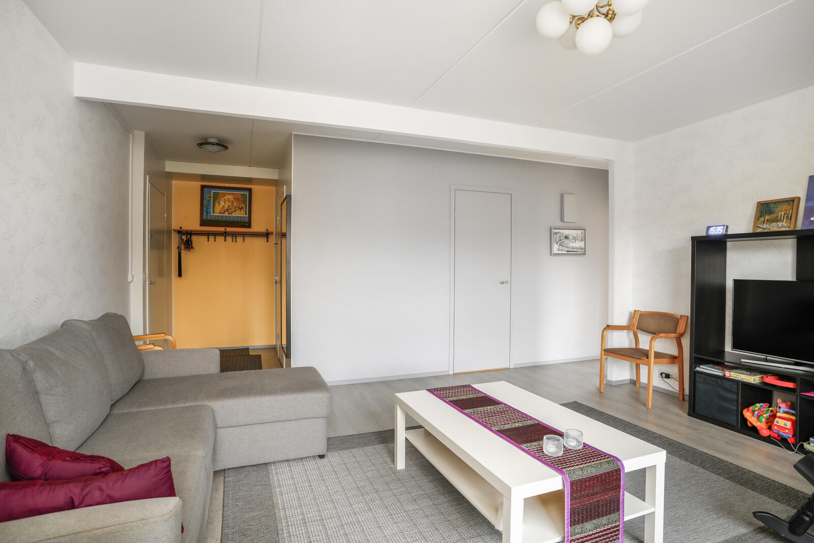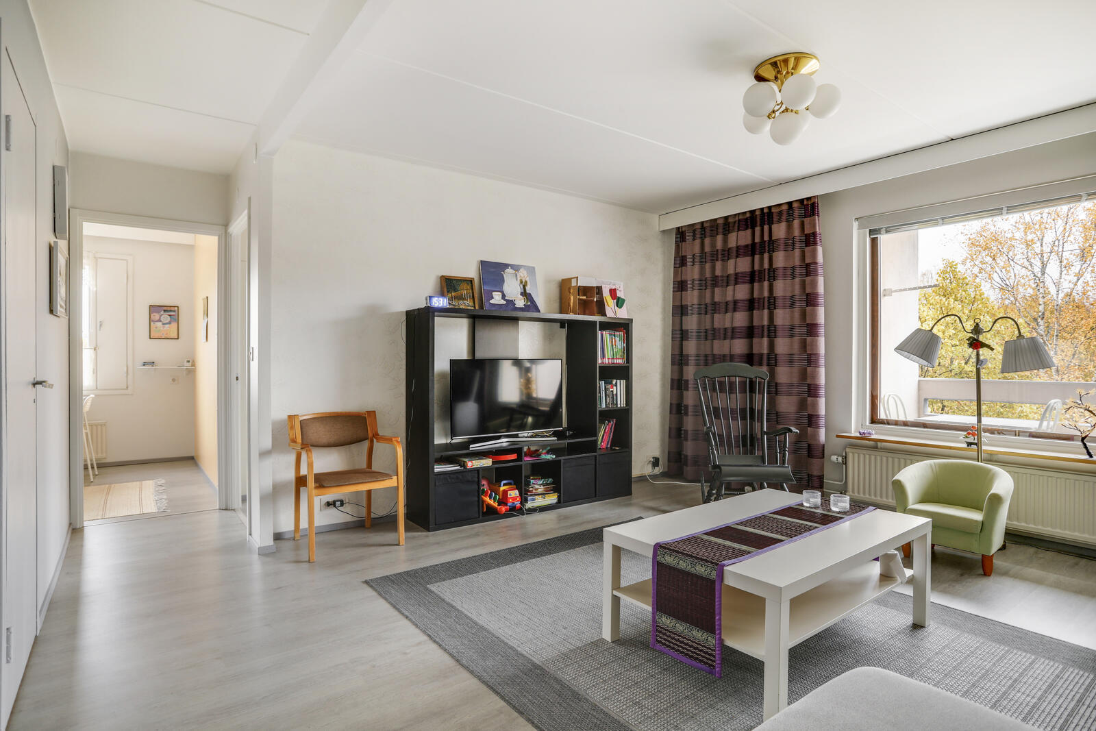 | Olohuoneen kuvaus | 2015; vanha lattia poistettu, asennettu laminaatti, eteisen ja olohuoneen välinen seinä poistettu, seinät tapetoitu ja katto maalattu. |