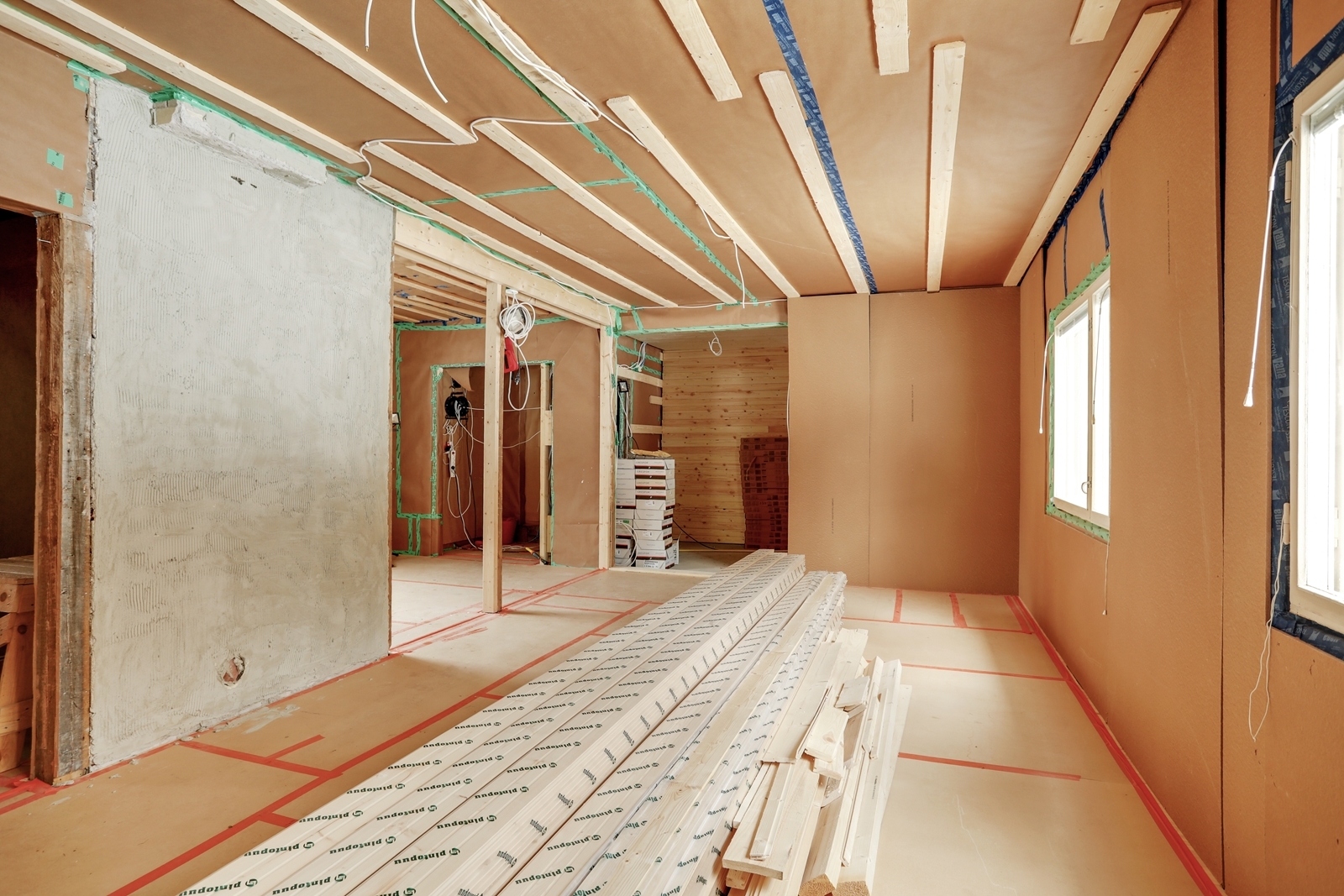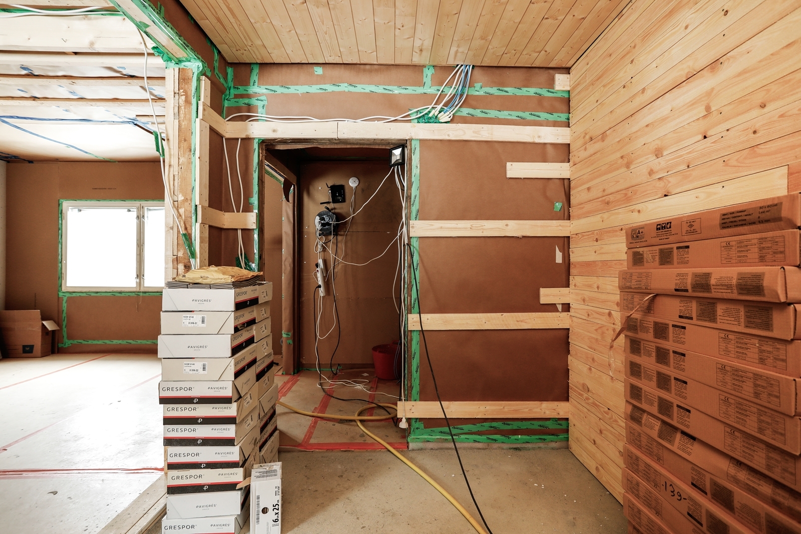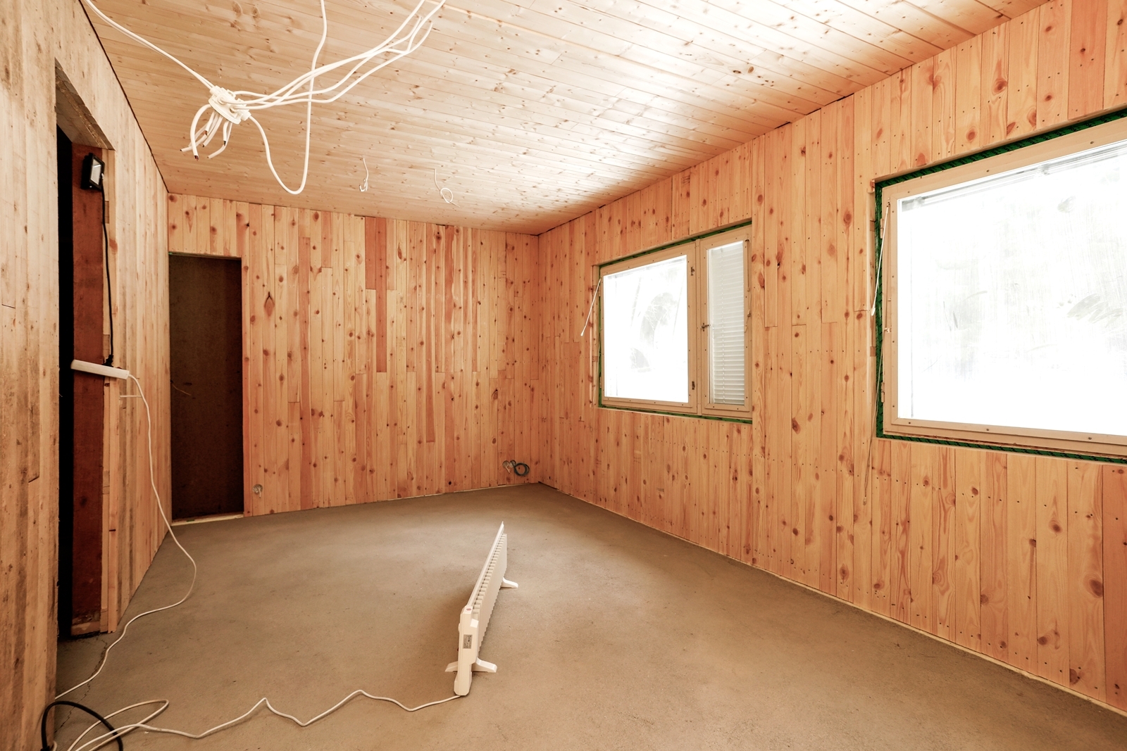 Vanhalla on puolella on tehty uusi puulattia. Laajennuspuolella uusi betonivalu, lattialämmitystekniikka laitettu valmiiksi, asennus puuttuu. |
