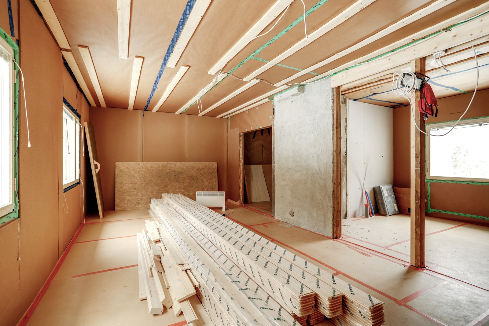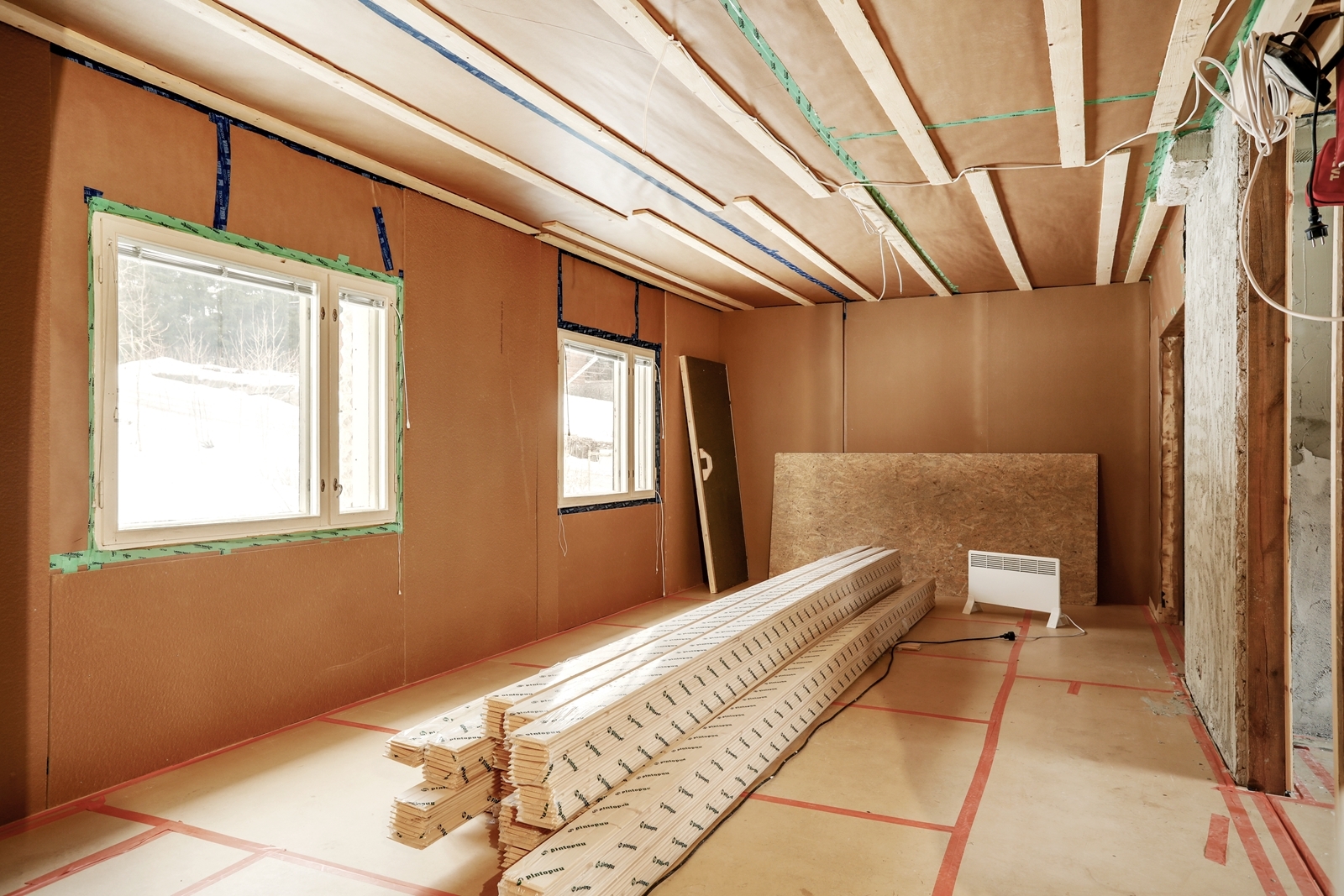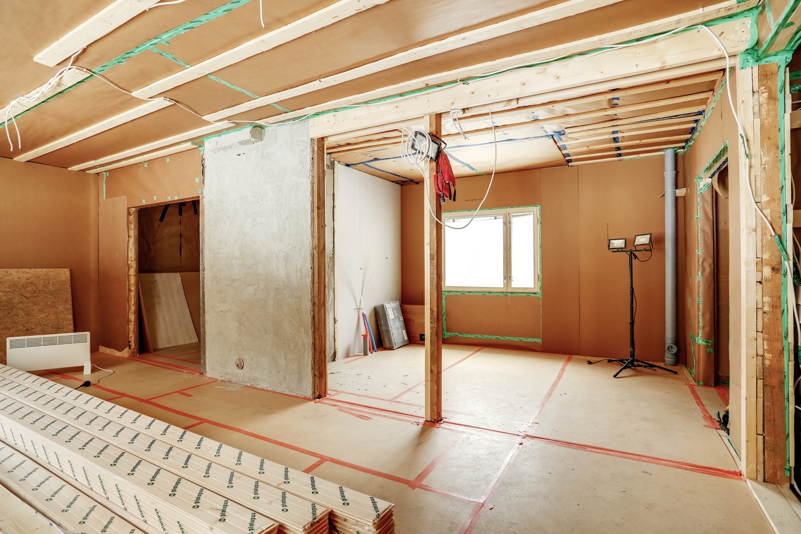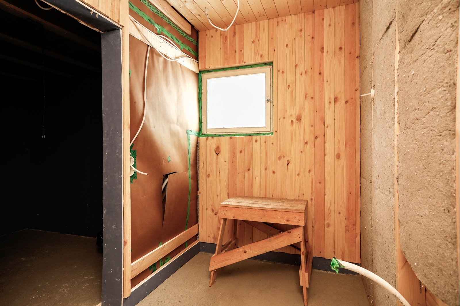 Vanhalla on puolella on tehty uusi puulattia. Laajennuspuolella uusi betonivalu, lattialämmitystekniikka laitettu valmiiksi, asennus puuttuu. |