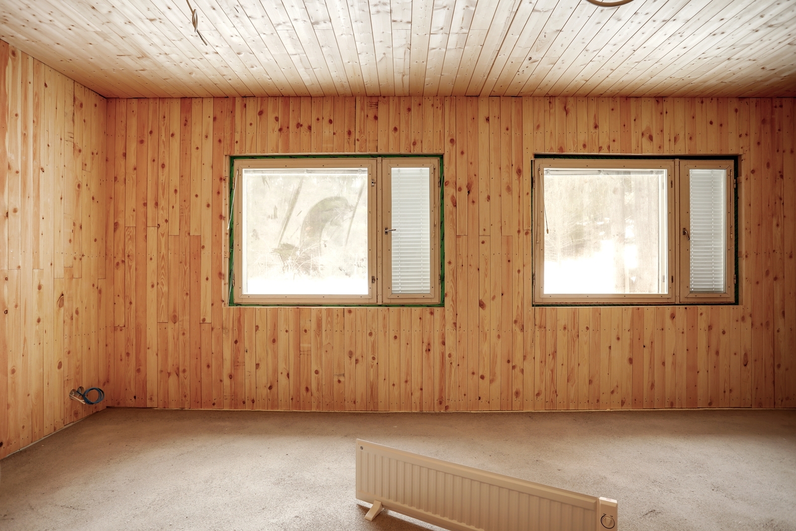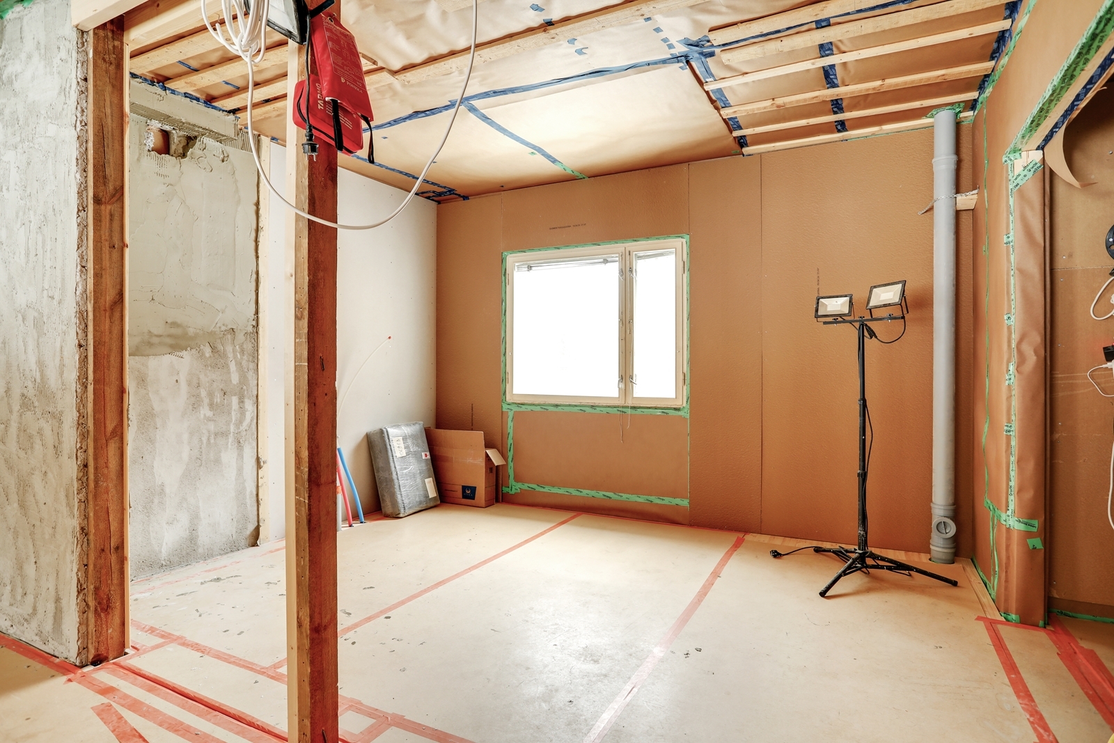 Lisäksi purettu keittiö, pesuhuone, sauna, wc, vanhat lattiapinnat ja seinät.Em.tilat pinnoitusta vaille, paitsi saunan rakentaminen. |