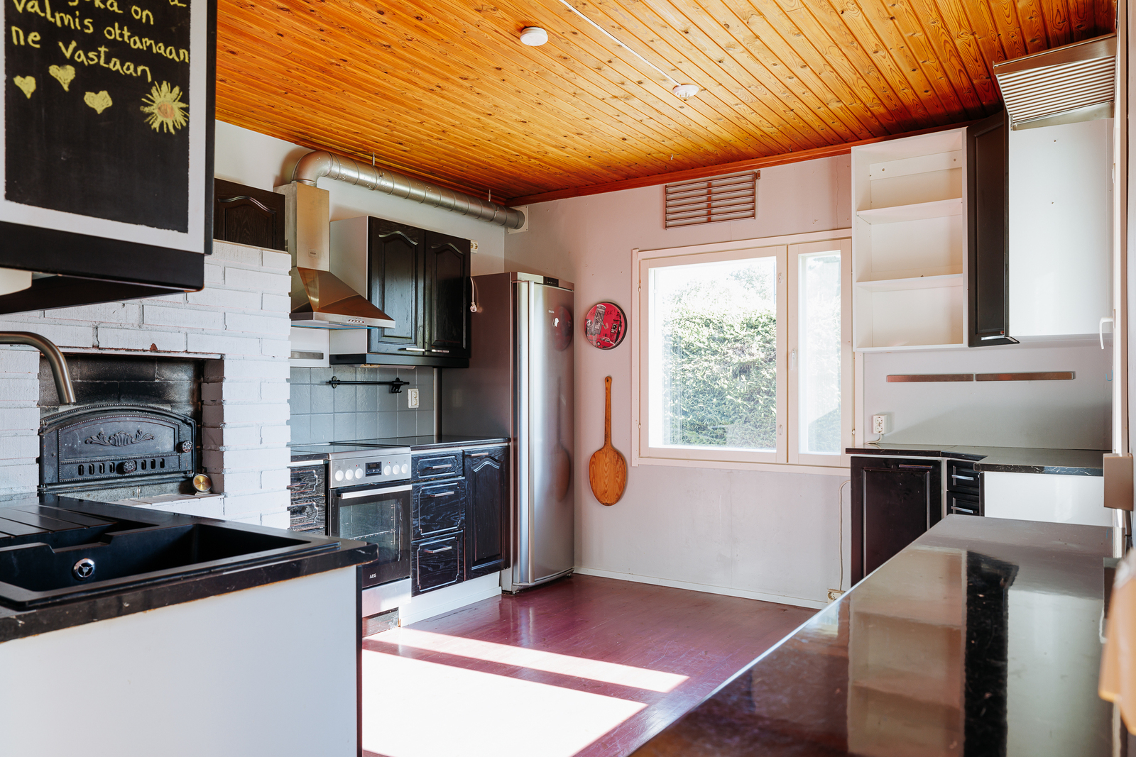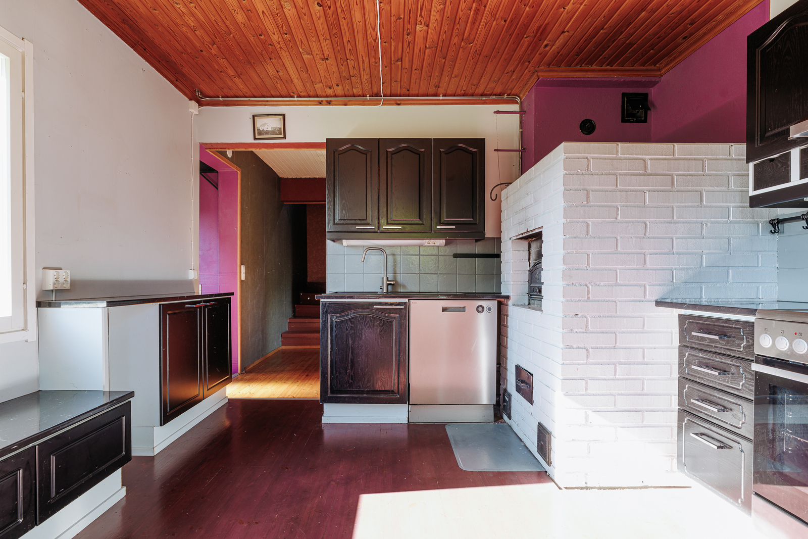 Liesi (sähköliesi, leivinuuni), seinät (maali), lattiat (lauta), uuni, jääkaappi, liesi ja astianpesukone |