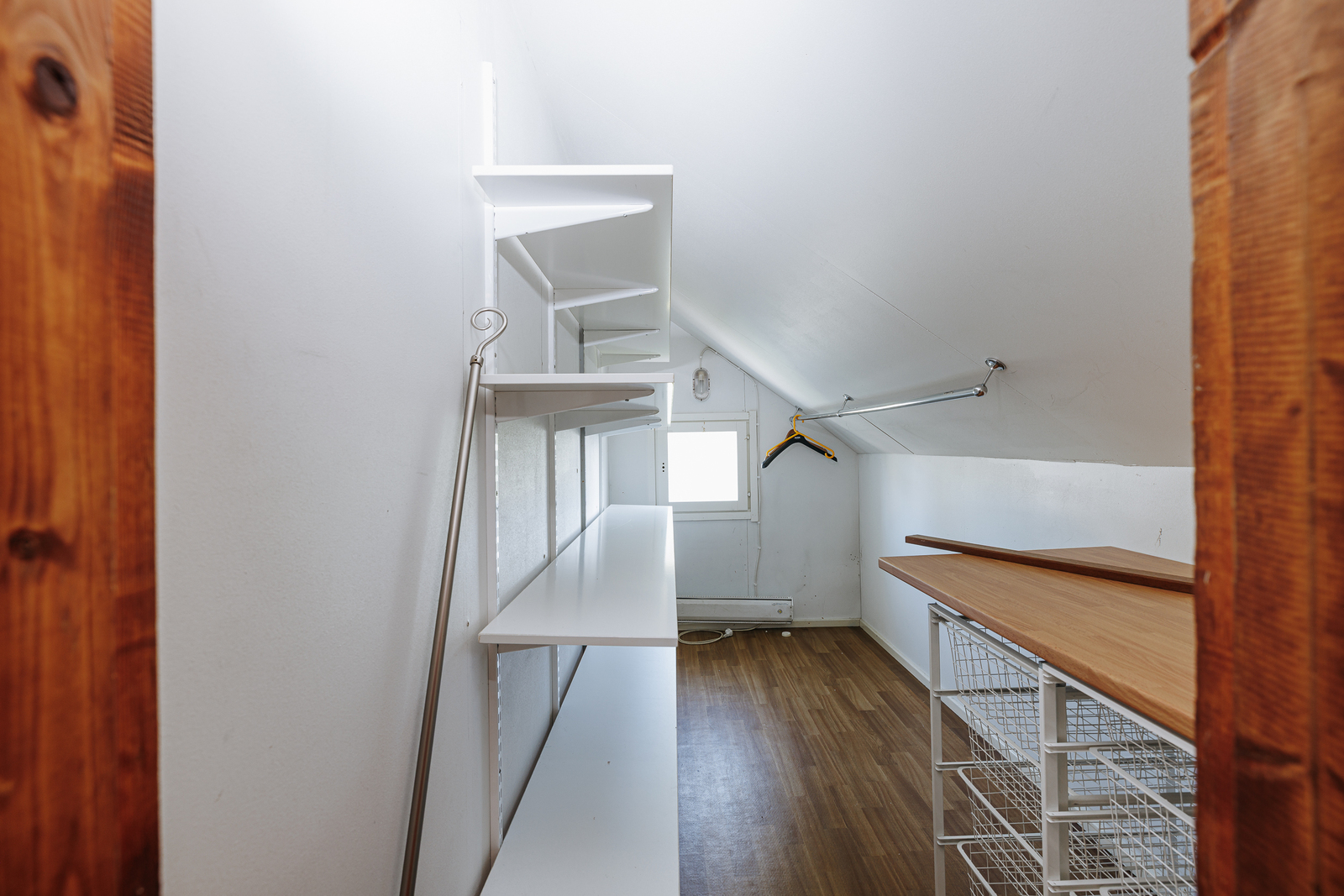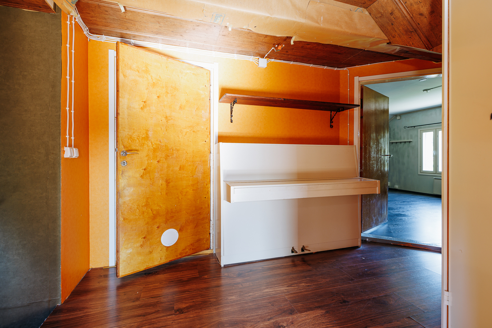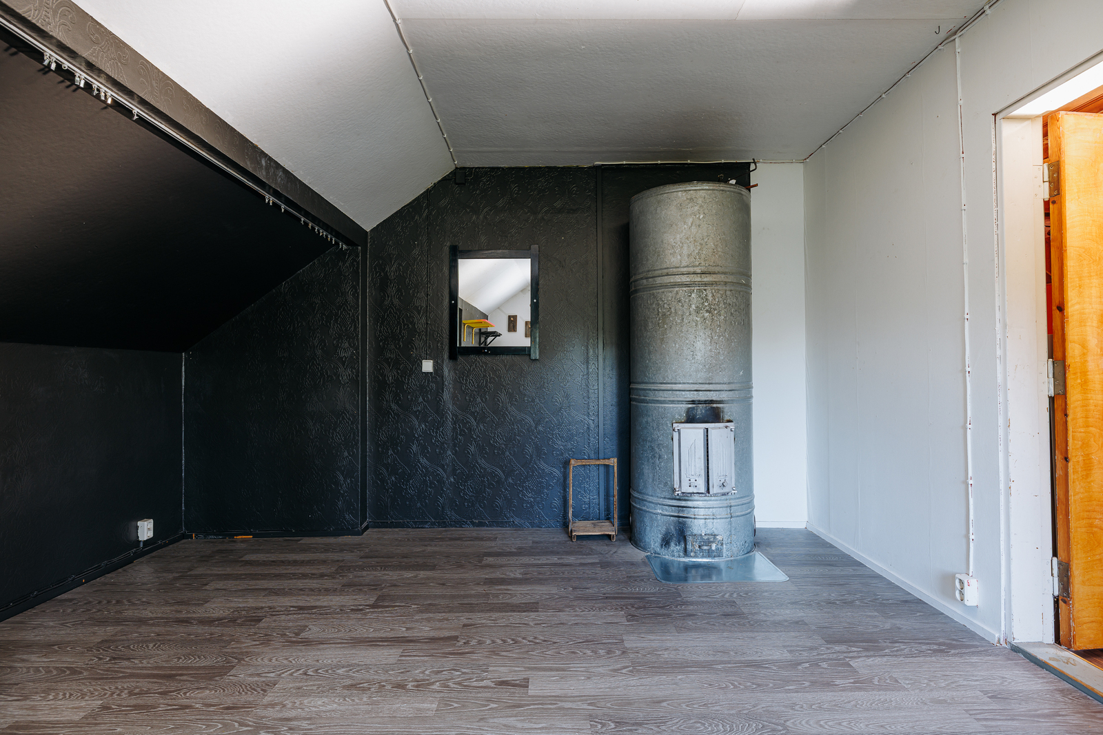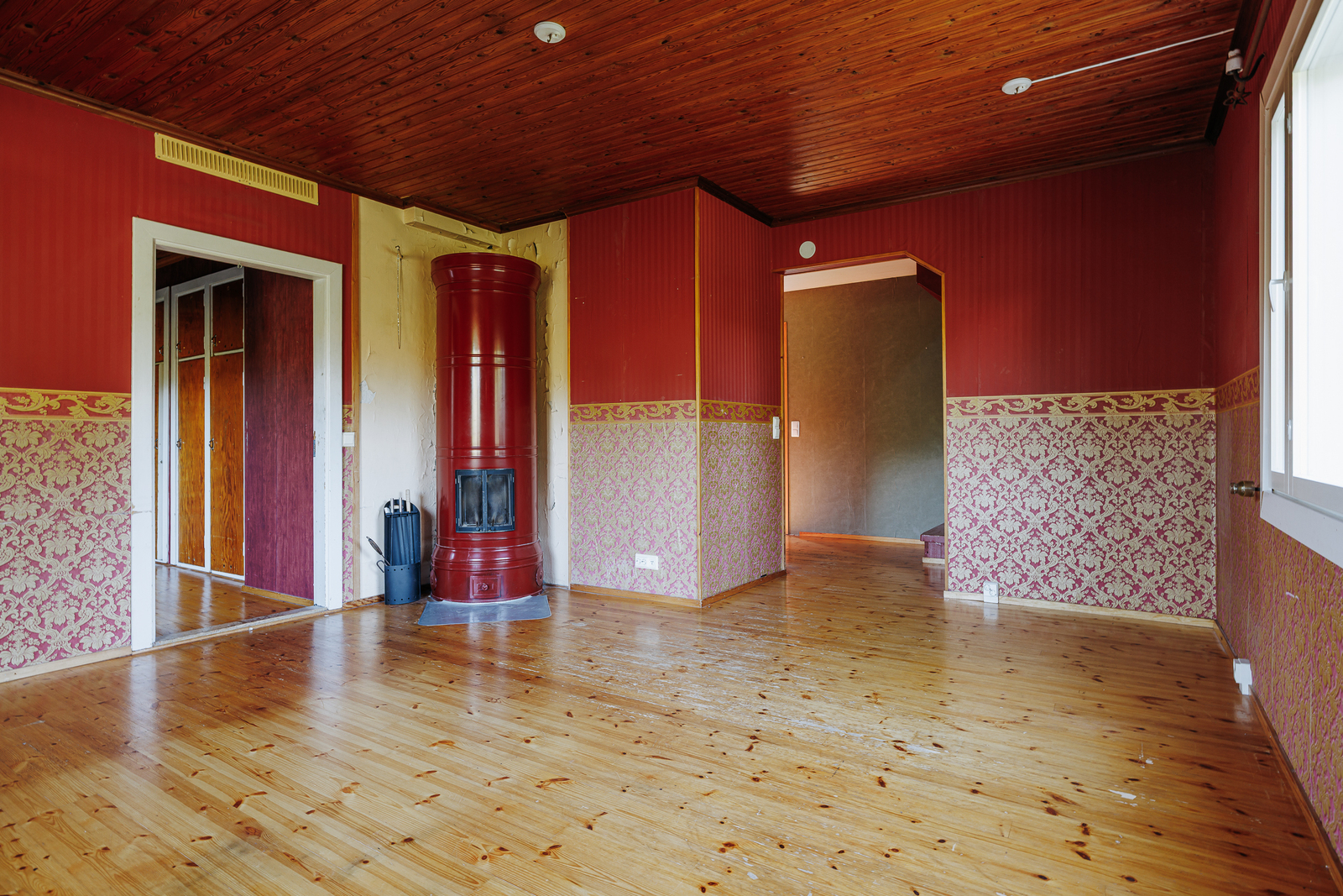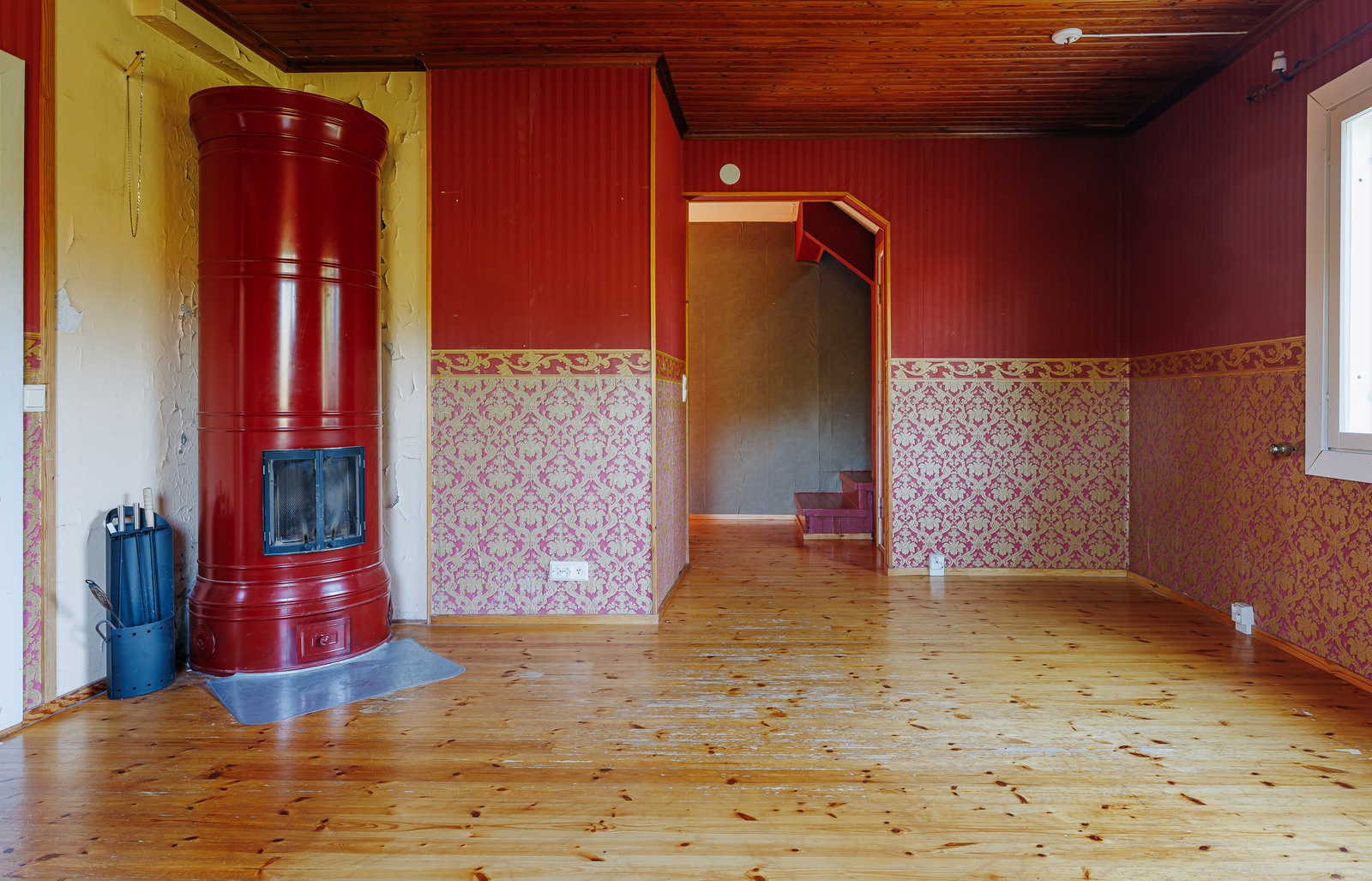 Yläkerran yhdessä makuuhuoneessa pystymuuri (pönttöuuni).