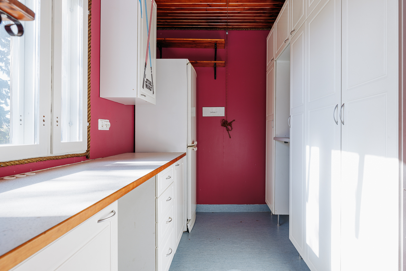 Pesukoneliitäntä, lattiat (muovimatto), seinät (maali), Kaappipakastin kodinhoitohuoneessa. |