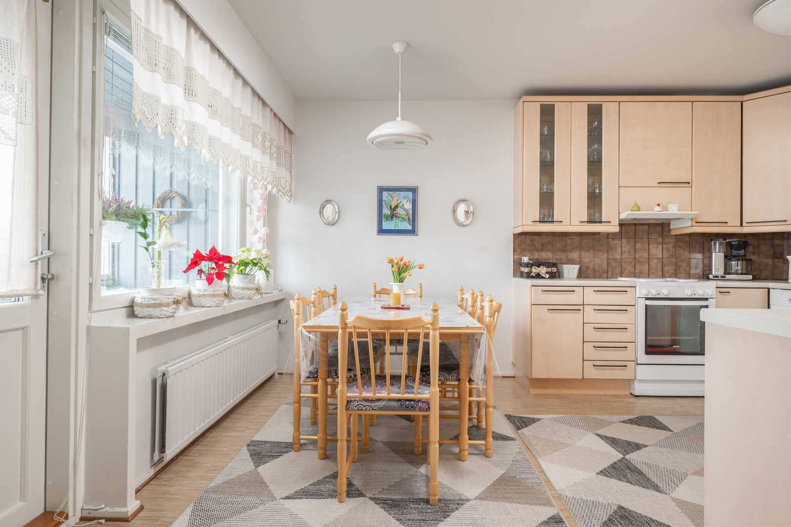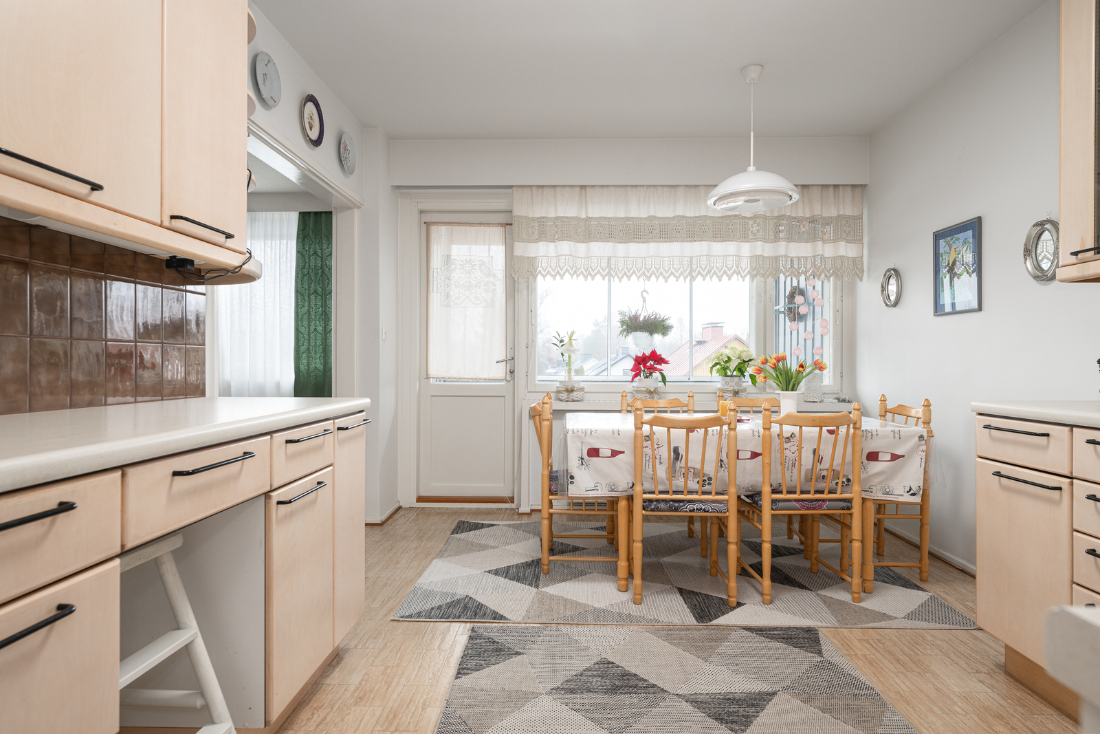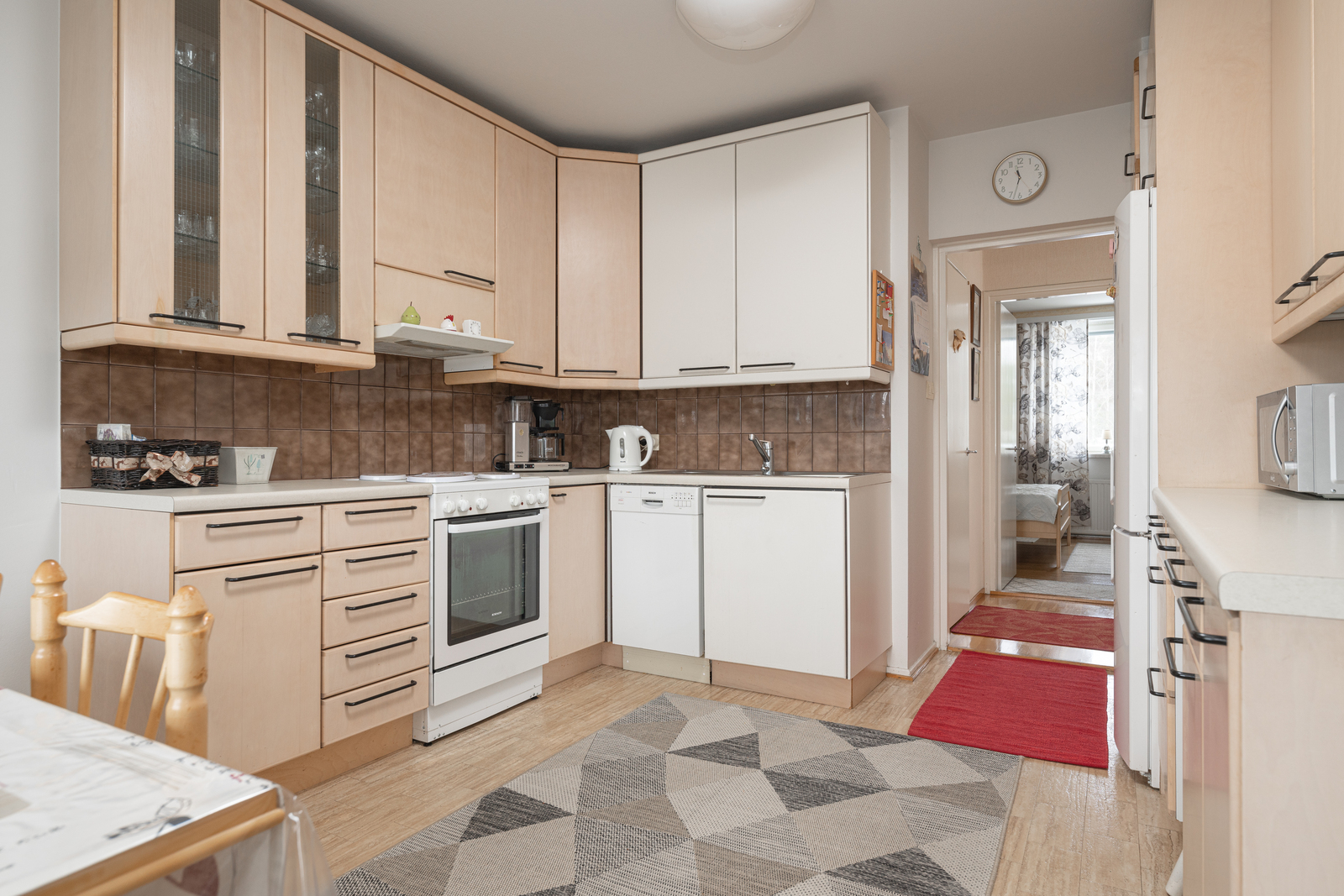 | Keittiön kuvaus | Liesi (sähköliesi), seinät (laatta ja maali), lattiat (muovimatto), liesi, liesituuletin, astianpesukone, jääkaappipakastin ja kiinteät valaisimet |