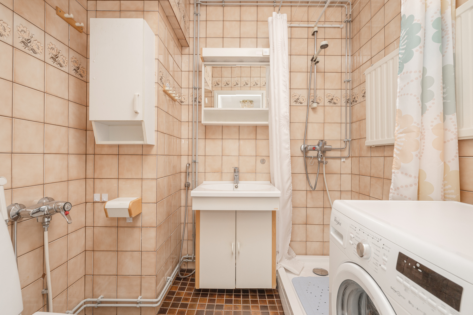| Kylpyhuoneen kuvaus | Pesukoneliitäntä, wc-istuin, suihku ja kiinteät valaisimet, seinät (kaakeli), lattiat (laatta) |