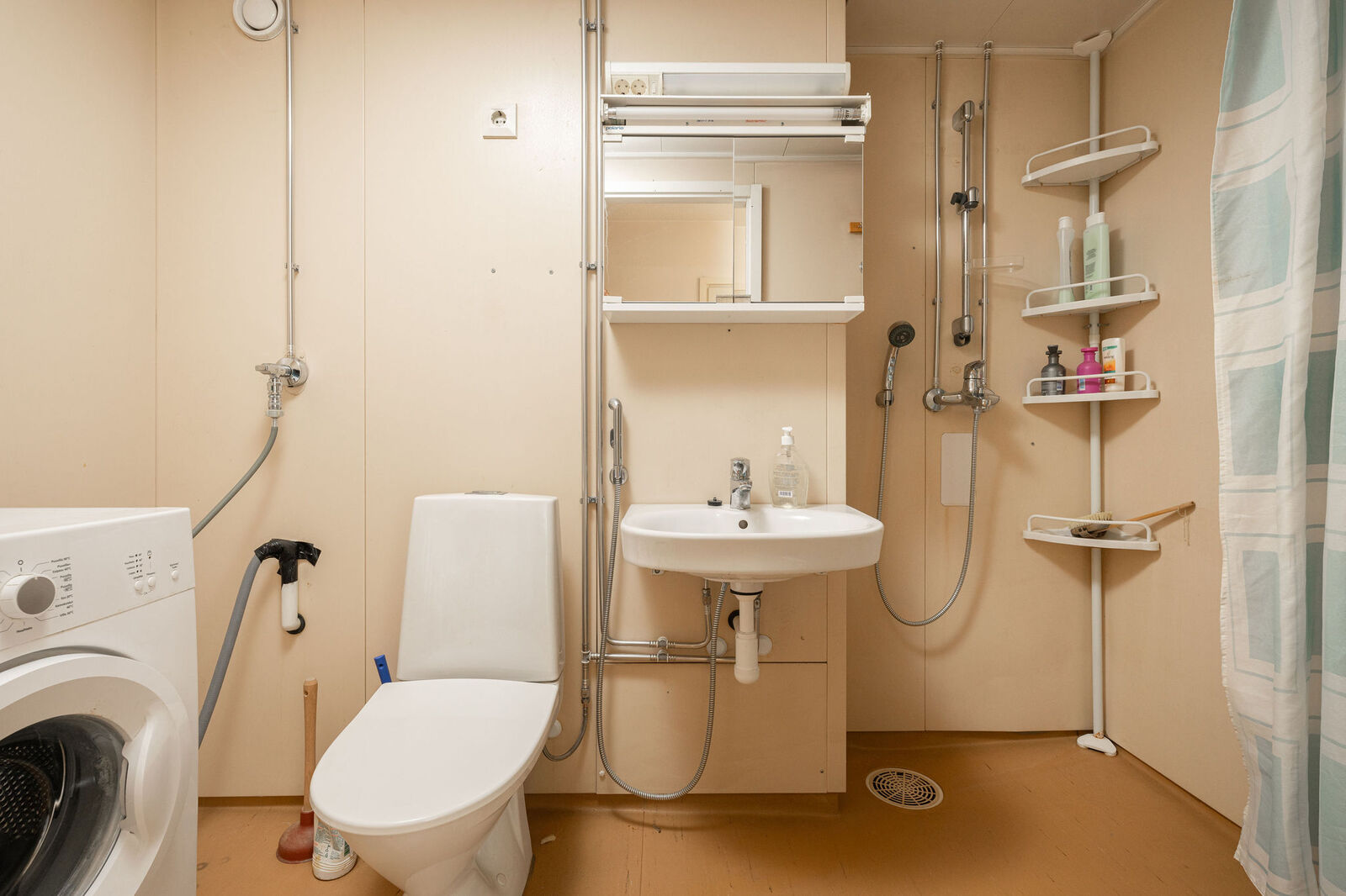 Pesukoneliitäntä, wc-istuin ja suihku, seinät (muovimatto), lattiat (muovimatto) |