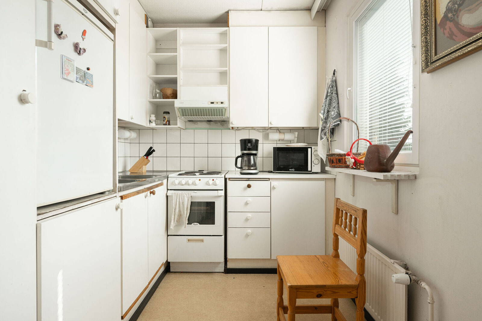 Liesi (sähköliesi), lattiat (muovimatto), jääkaappi, liesi ja liesituuletin / hormi |