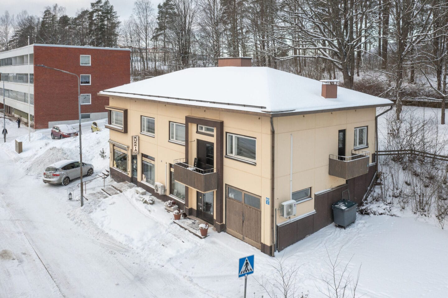 Yläkerrassa on kaksi asuntoa. Isompi asunto on 83 m² (2mh+oh+rt+k+kph+wc) ja pienempi 40 m² (mh+oh+k+wc).