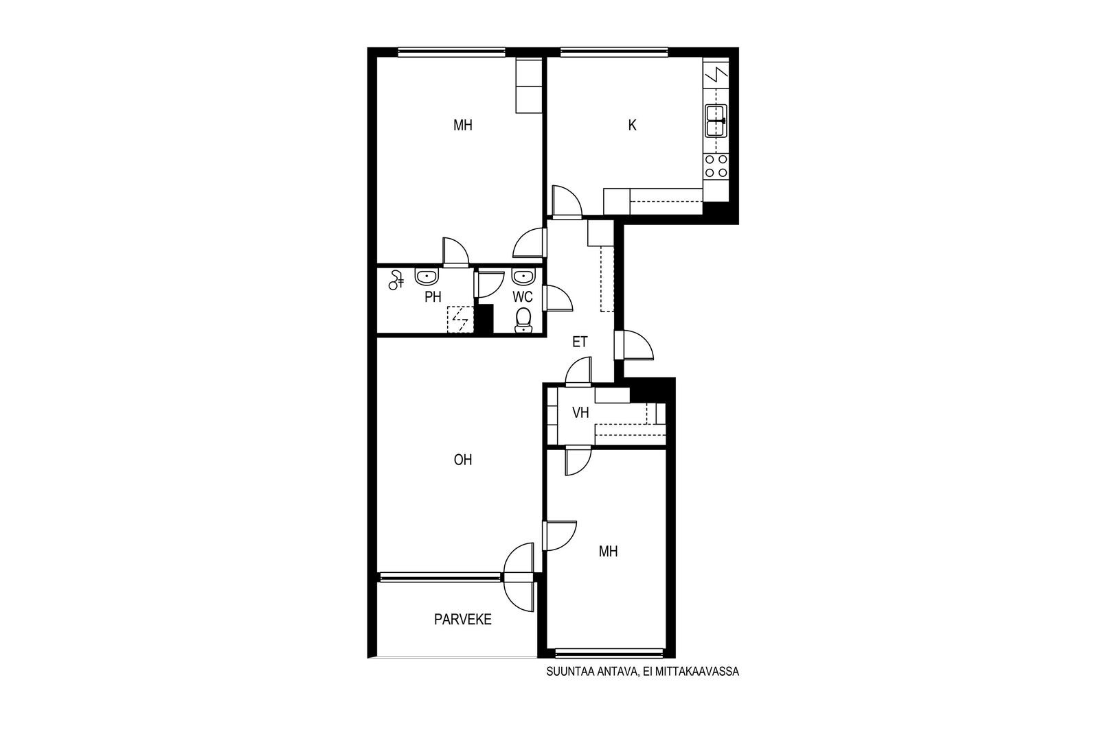 3h, k, pesutilat, vh, iso lasitettu parveke ( yht.järj. 3 H + K). |