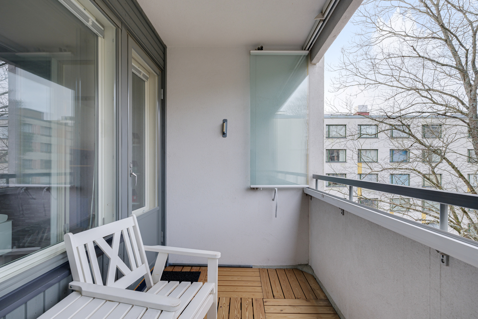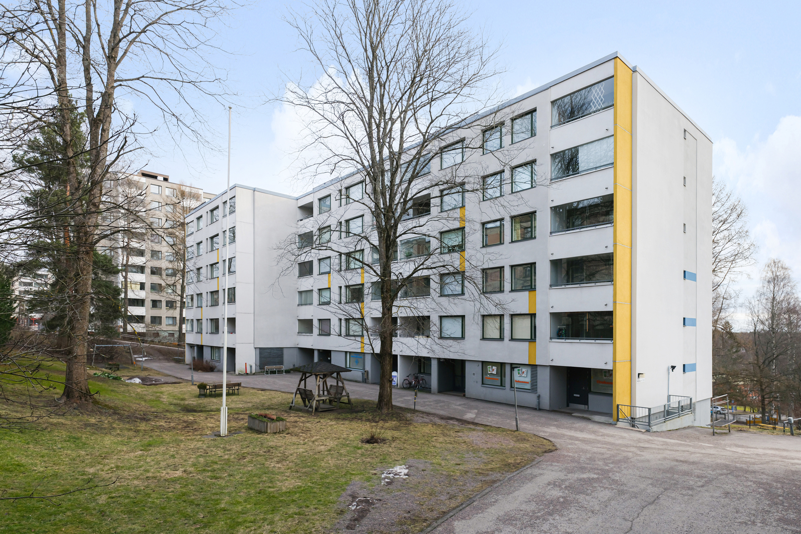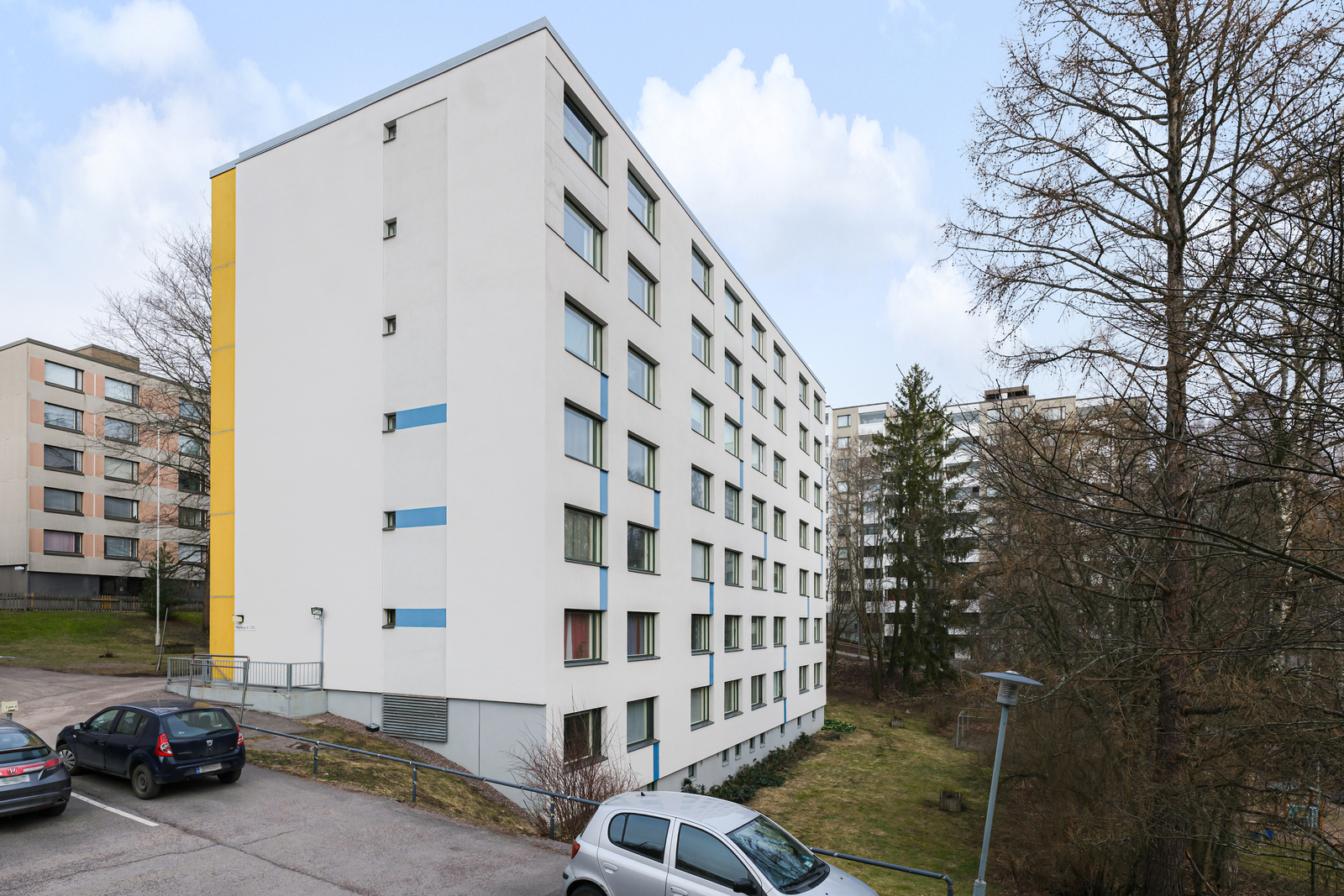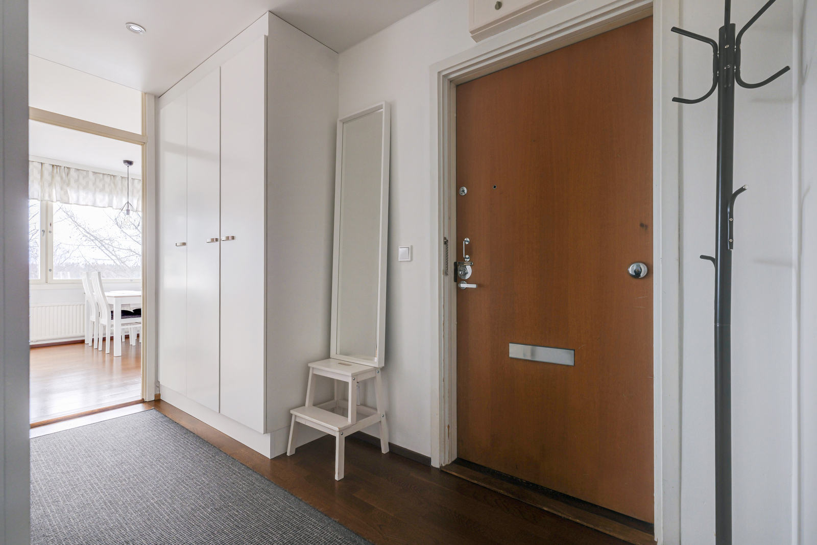 Vuonna 2018 linjasaneeratussa hissitalossa sijaitseva koti tarjoaa suuret ja käytännölliset huoneet sekä esteettömät näkymät idän suuntaan aina Håkansbölen ja Hakunilan ulkoilualueille asti. Olohuoneesta on käynti isolle lasitetulle parvekkeelle, joka toimii viihtyisänä lisähuoneena aikaisesta keväästä pitkälle syksyyn.