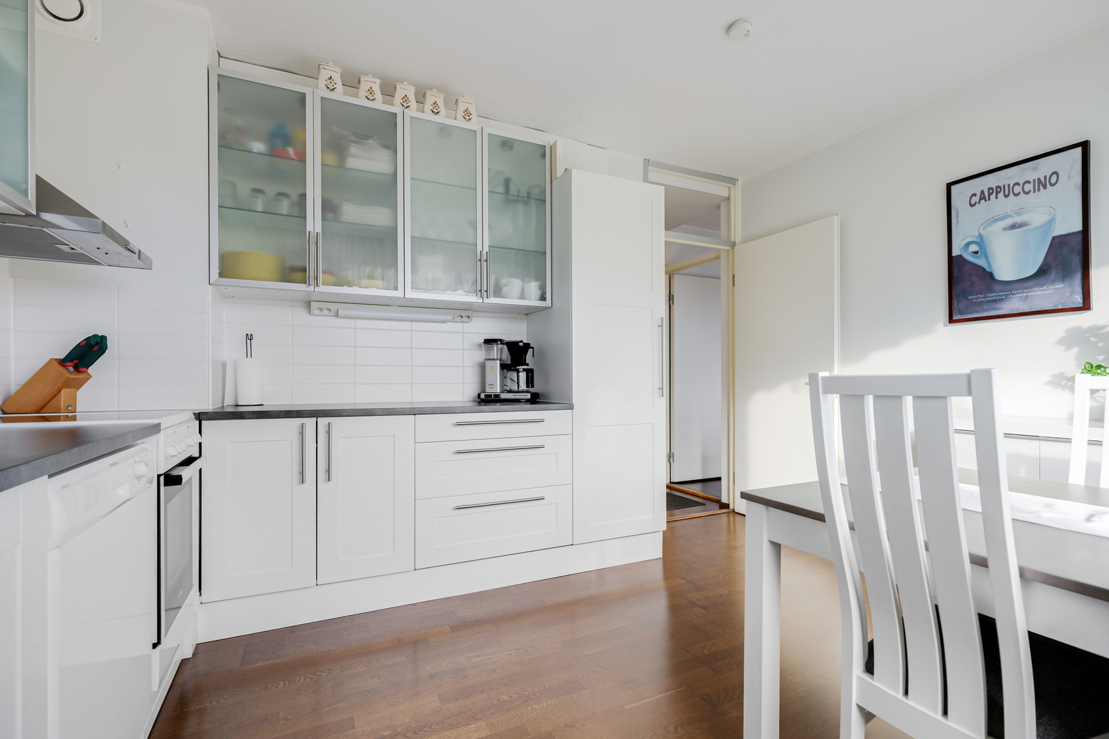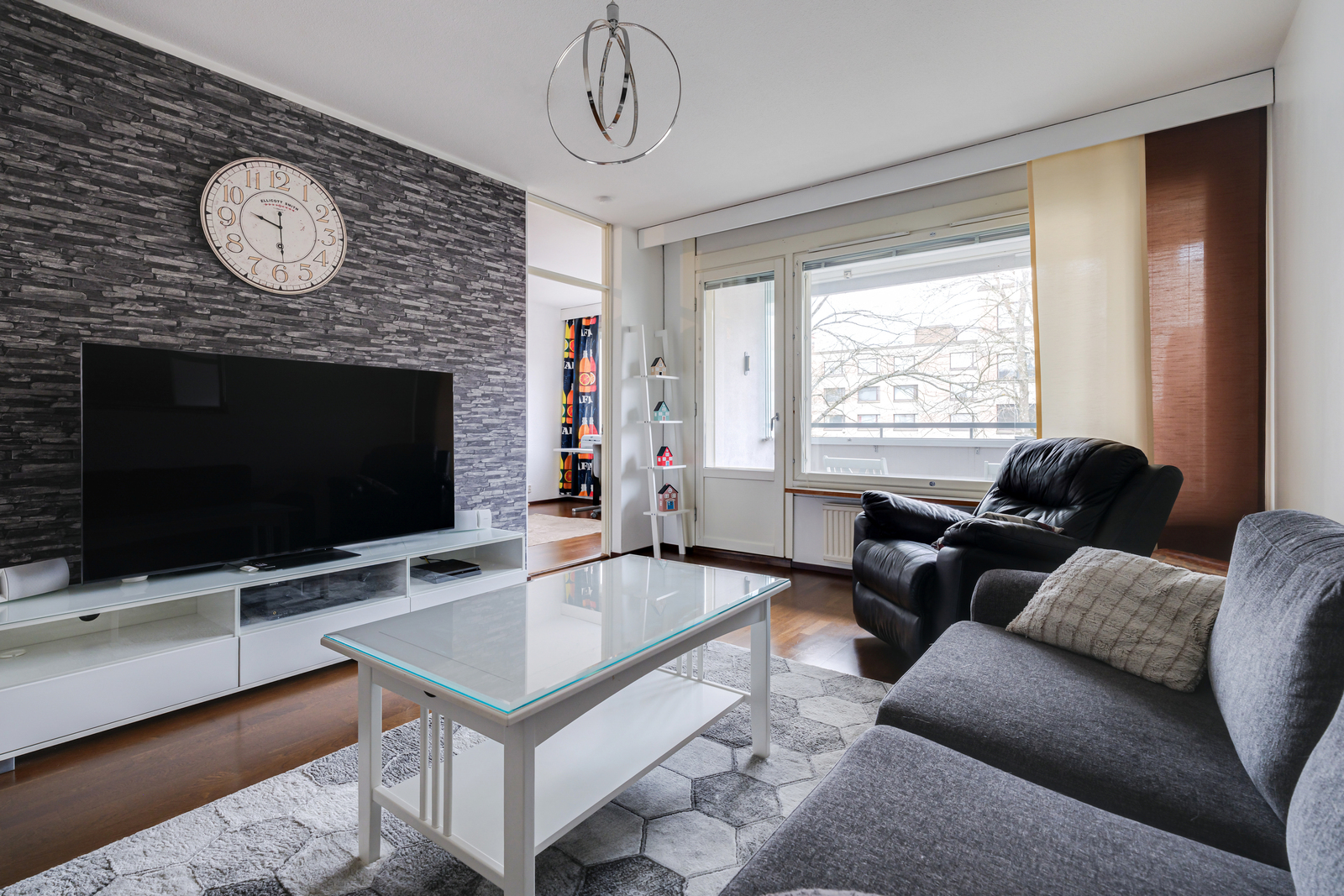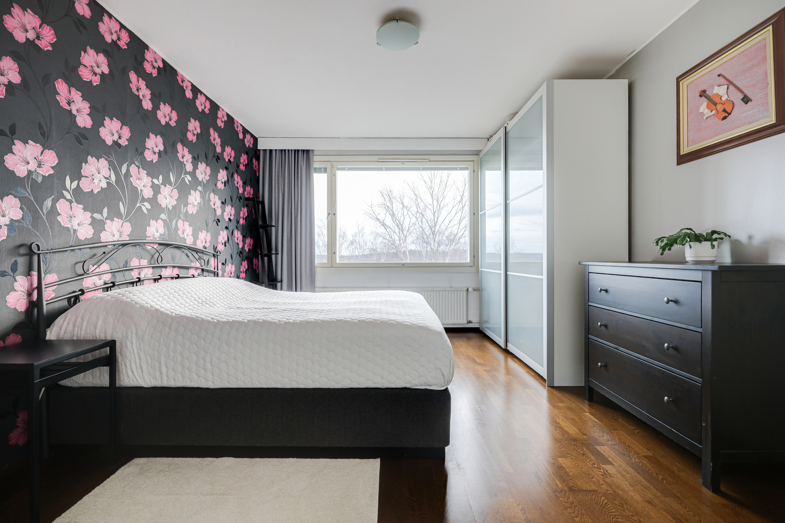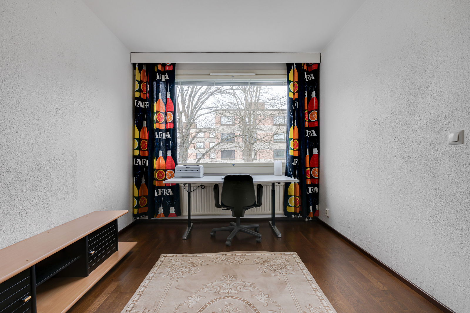 Vuonna 2018 linjasaneeratussa hissitalossa sijaitseva koti tarjoaa suuret ja käytännölliset huoneet sekä esteettömät näkymät idän suuntaan aina Håkansbölen ja Hakunilan ulkoilualueille asti. Olohuoneesta on käynti isolle lasitetulle parvekkeelle, joka toimii viihtyisänä lisähuoneena aikaisesta keväästä pitkälle syksyyn.