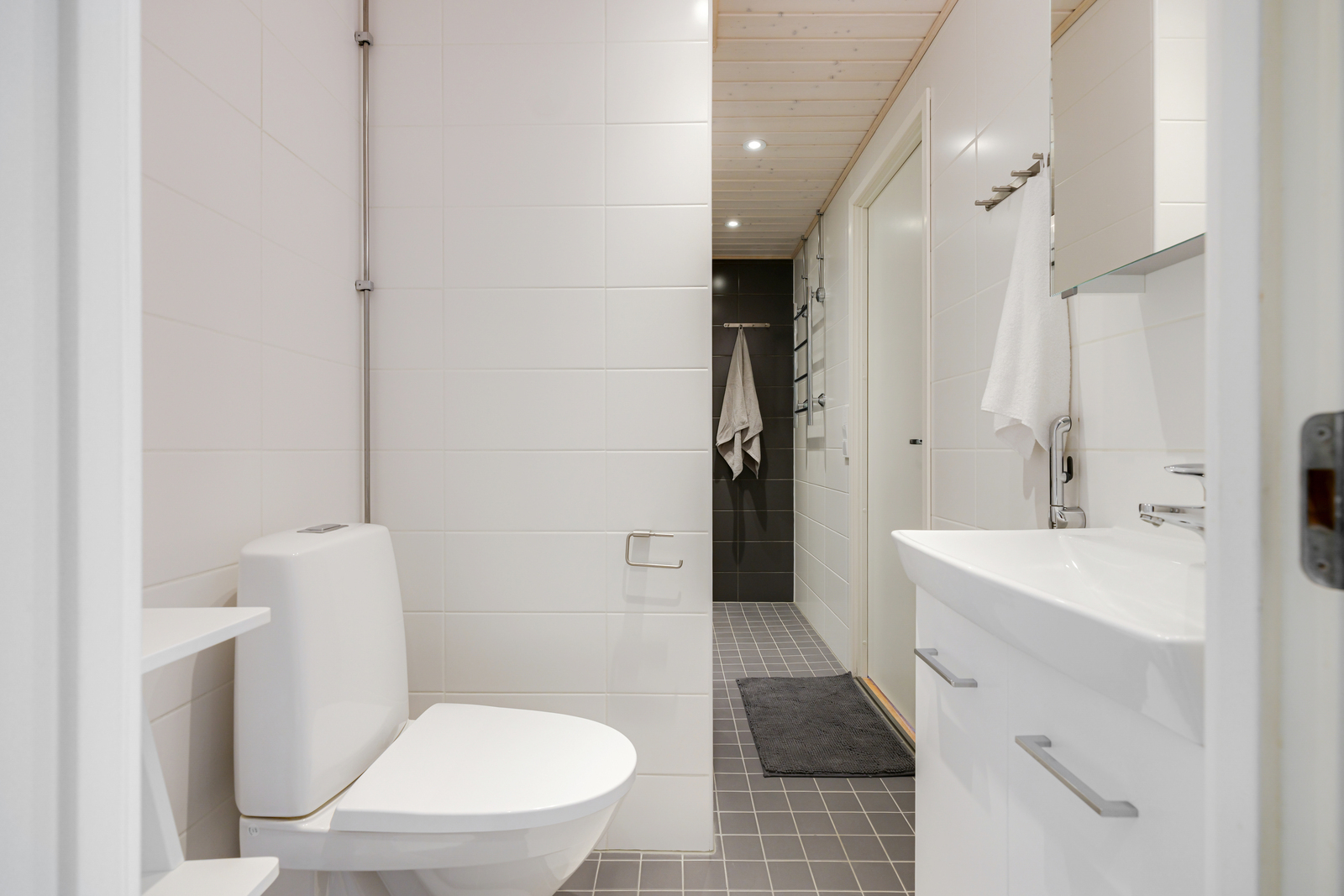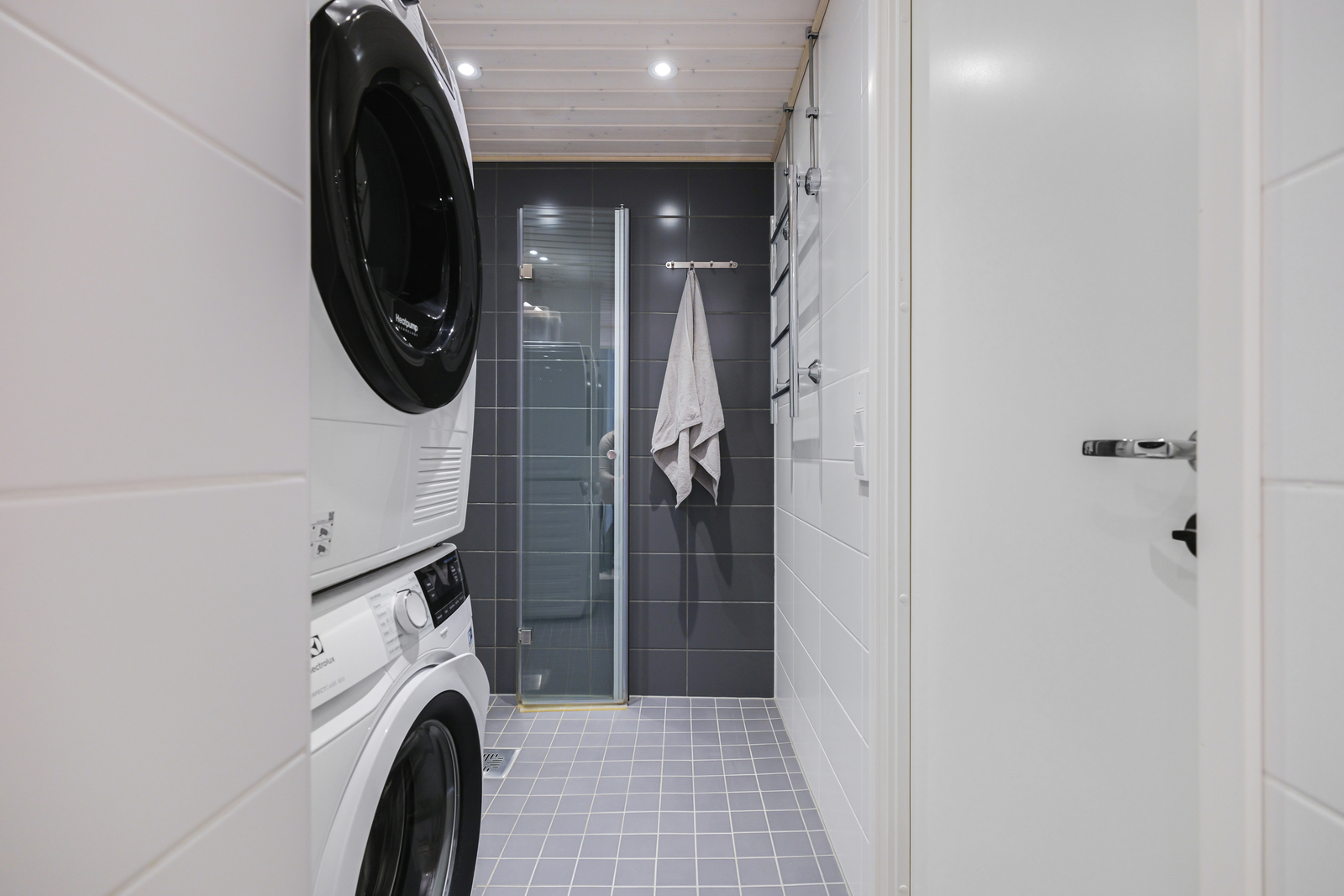 WC-istuin, peilikaappi, pesukoneliitäntä, suihkuseinä ja kiinteät valaisimet, lattiat (laatta) |