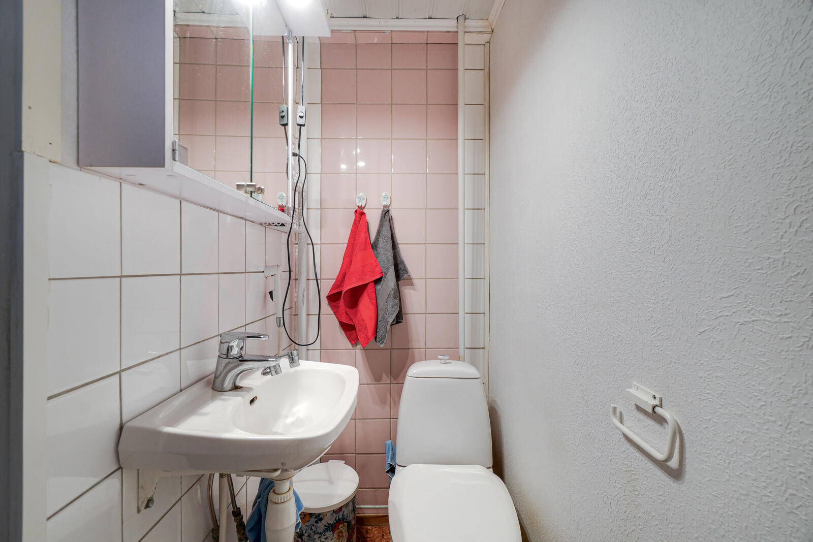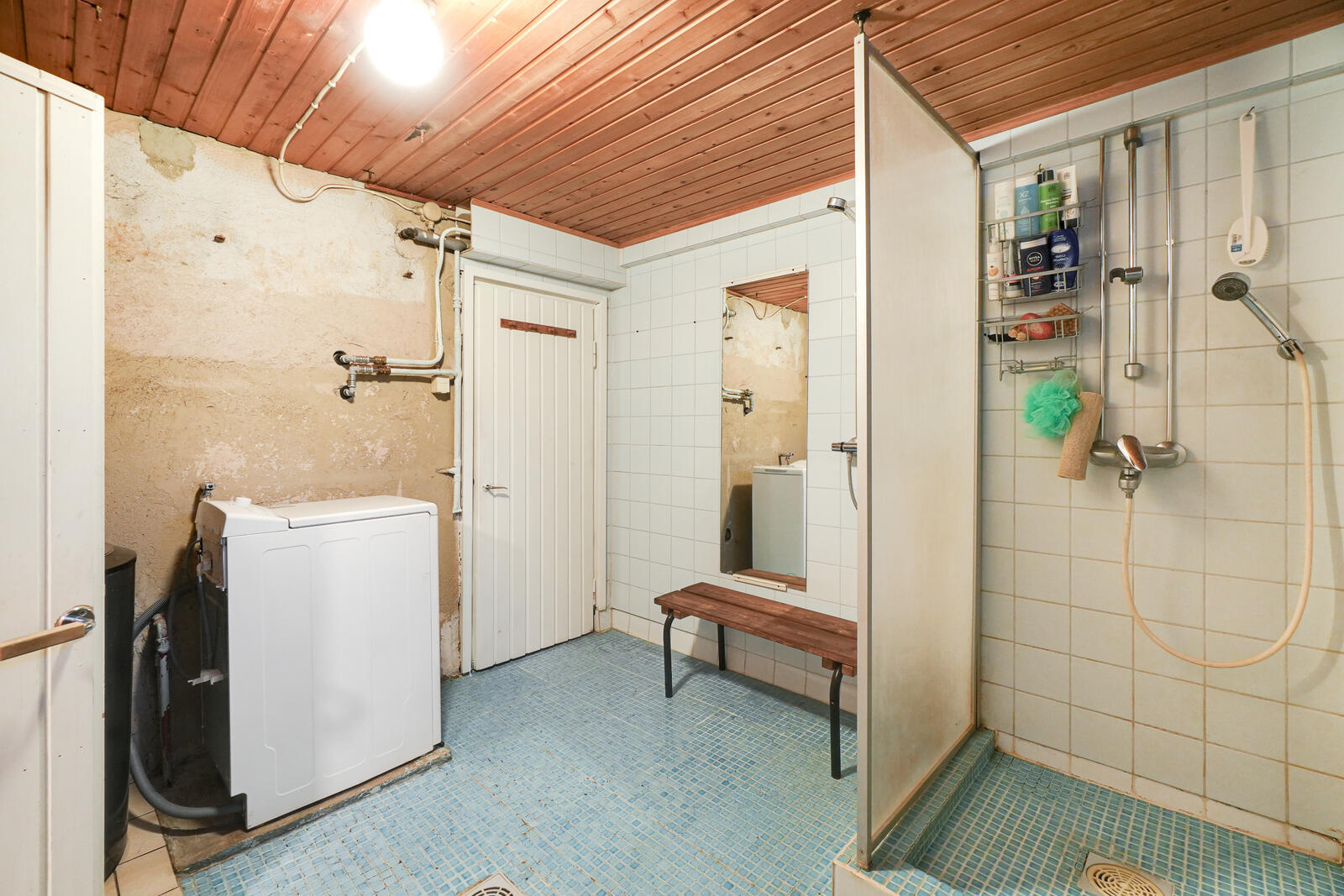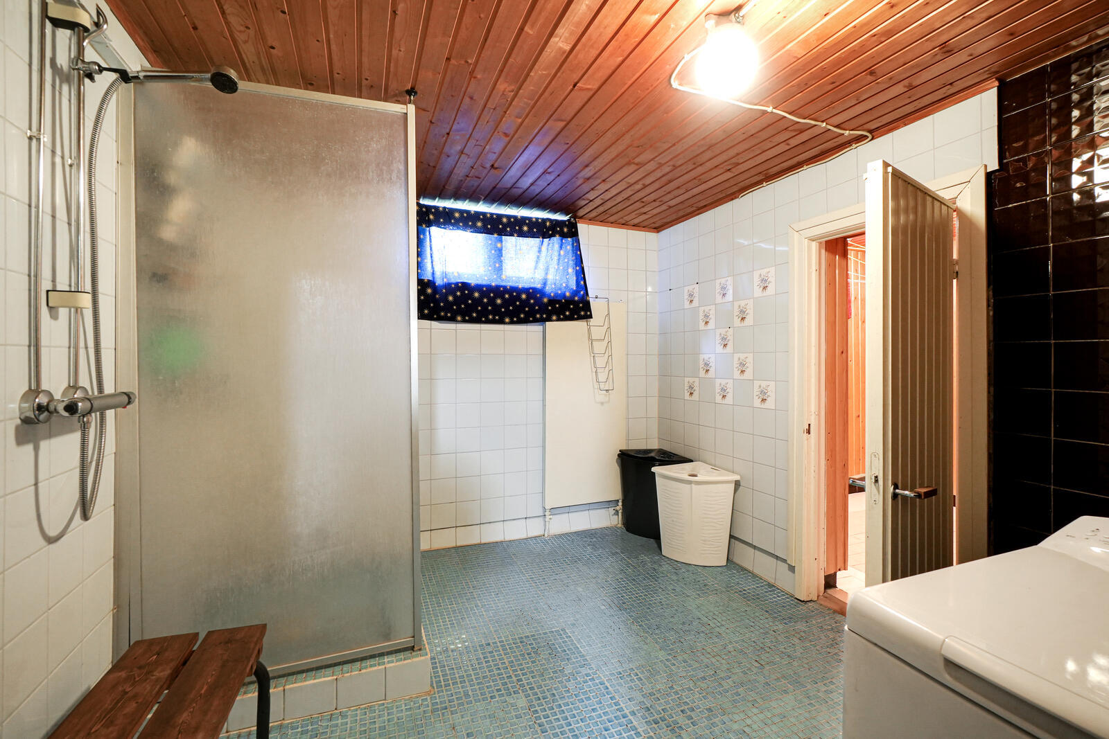 Pesukoneliitäntä, suihku ja kiinteät valaisimet, seinät (kaakeli), lattiat (laatta) |