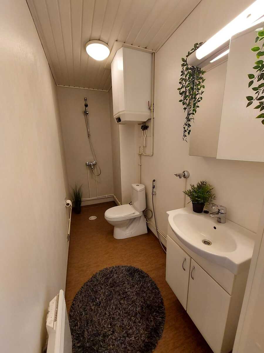 Peili, pesukoneliitäntä, suihku, wc-istuin ja kiinteät valaisimet, seinät (muovimatto), lattiat (muovimatto) |