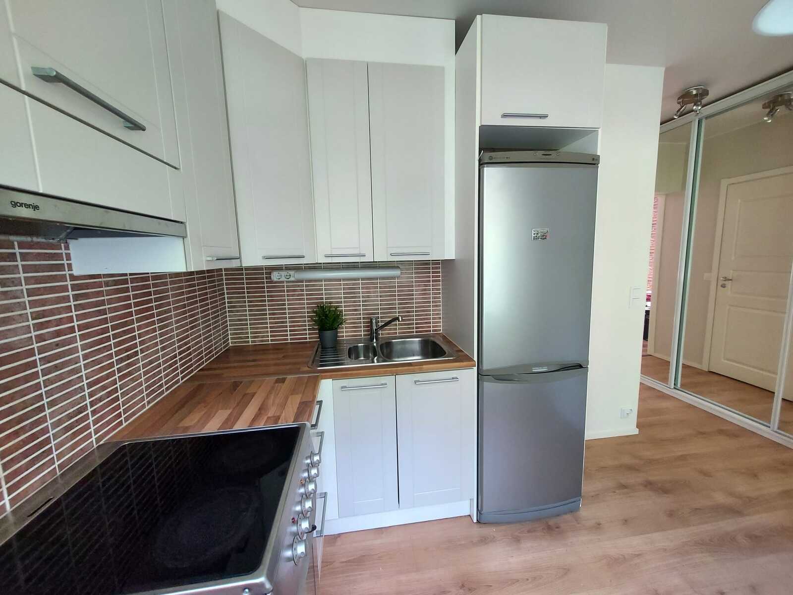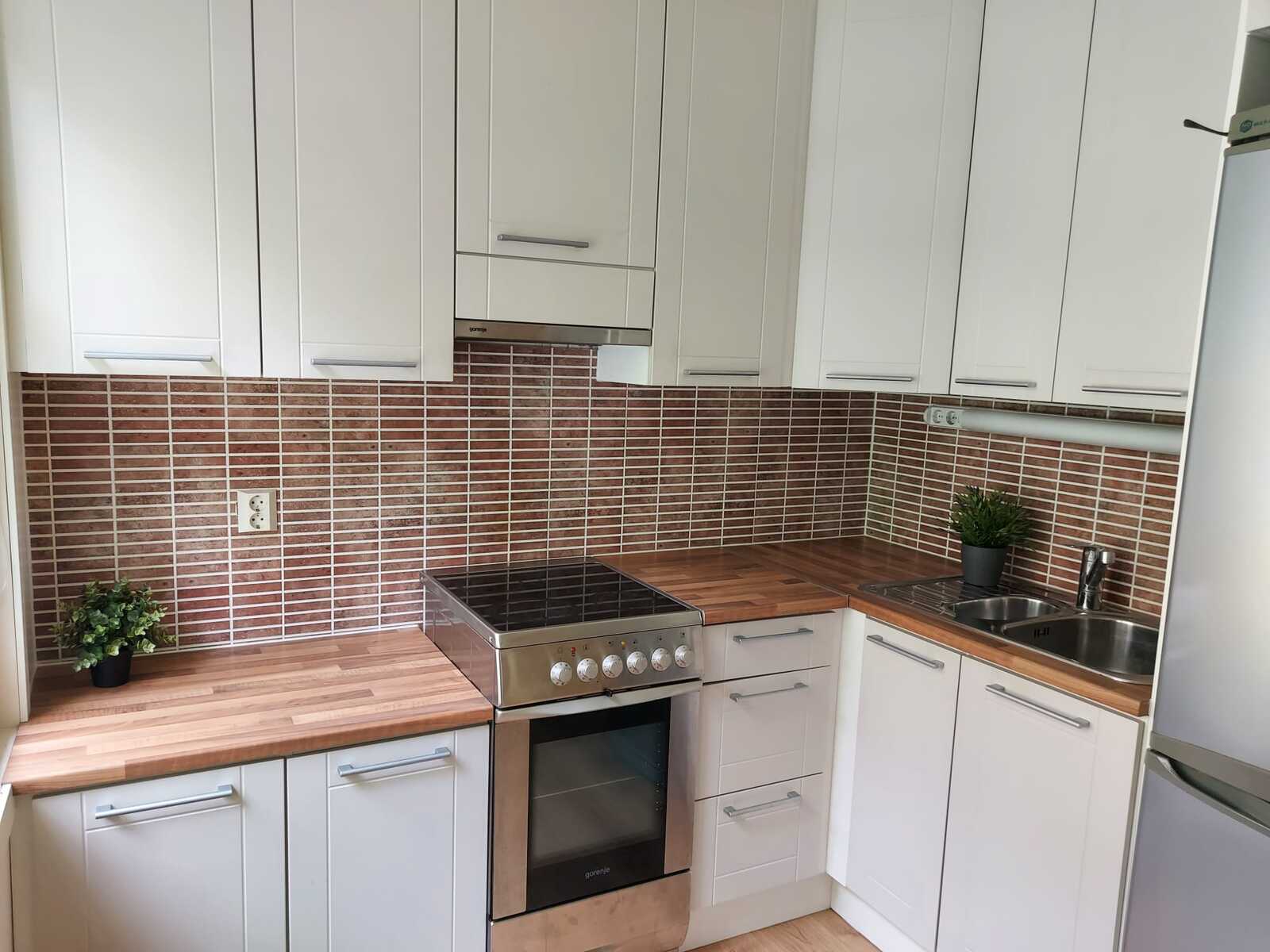 Liesi (Keraaminen liesi), työtasot (laminaatti), seinät (maali), lattiat (laminaatti), jääkaappipakastin, liesituuletin ja kiinteät valaisimet |