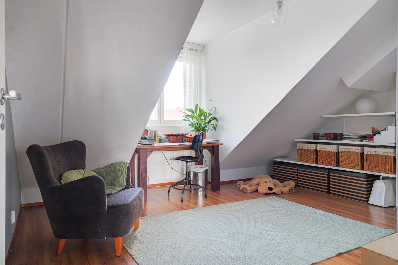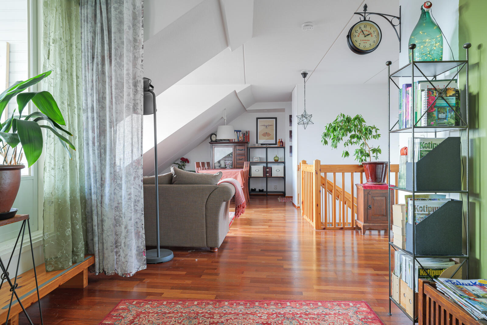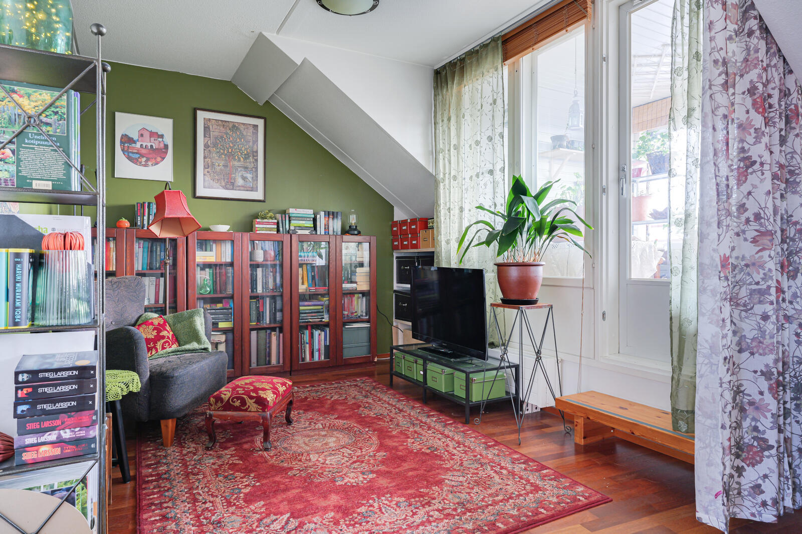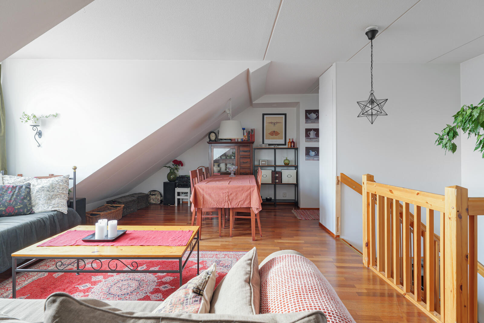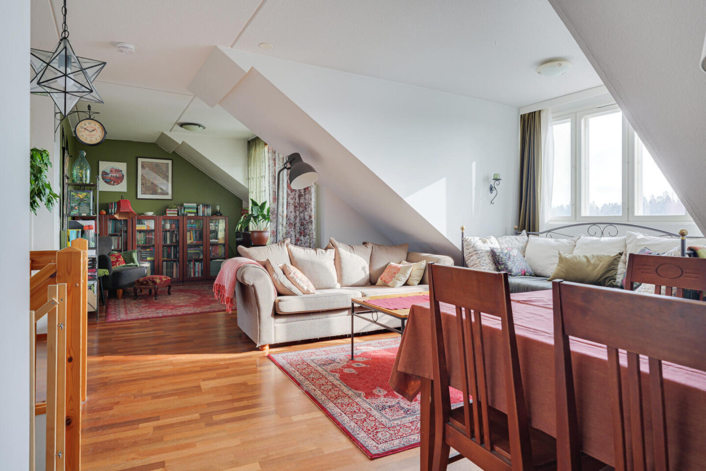 Tämä ylimmän kerroksen koti tarjoaa harvinaista arjen luksusta kahdessa tasossa. Persoonalliset vinokatot ja lasitettu parveke tekevät kokonaisuudesta ainutlaatuisen. Parvekkeelta avautuvat maisemat rauhoittavat, kuin näkymä suoraan mielenmaisemaan.