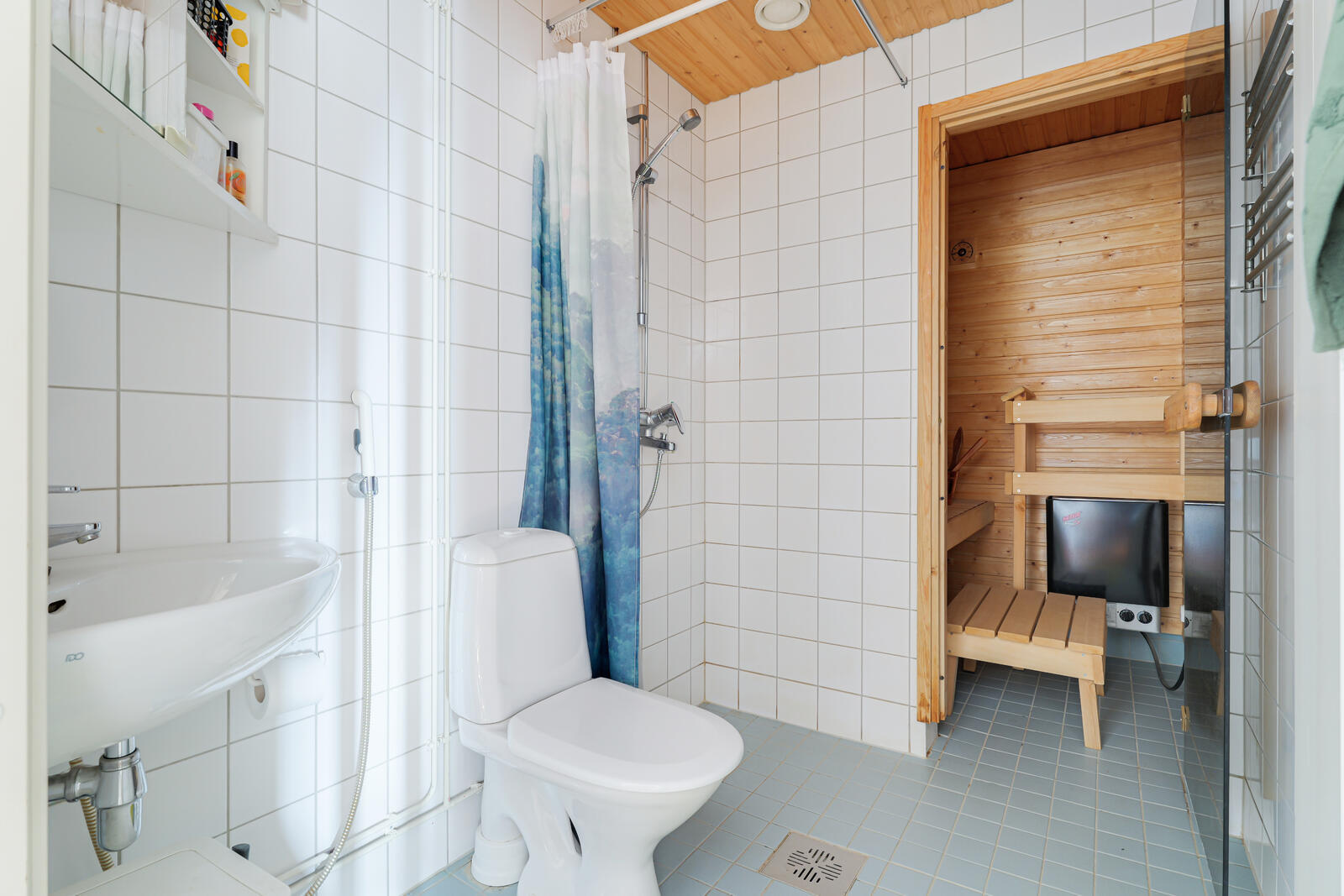 Upstairs features a living room, kitchen, two bedrooms, a sauna, and a bathroom. Entry is from the lower level, where you’ll also find the third bedroom and a separate toilet. The floor plan is clear and versatile, offering flexibility for everyday family life as well as remote work.