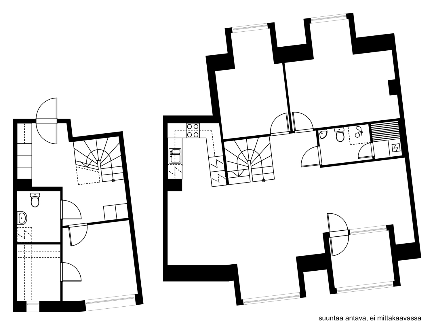 Yläkerrassa sijaitsee olohuone, keittiö, kaksi makuuhuonetta, sauna ja kylpyhuone. Alakerrasta tullaan sisään, ja siellä sijaitsevat kolmas makuuhuone sekä erillinen wc. Pohjaratkaisu on selkeä ja monikäyttöinen, tarjoten joustavuutta niin perheen arkeen kuin etätyöhönkin.