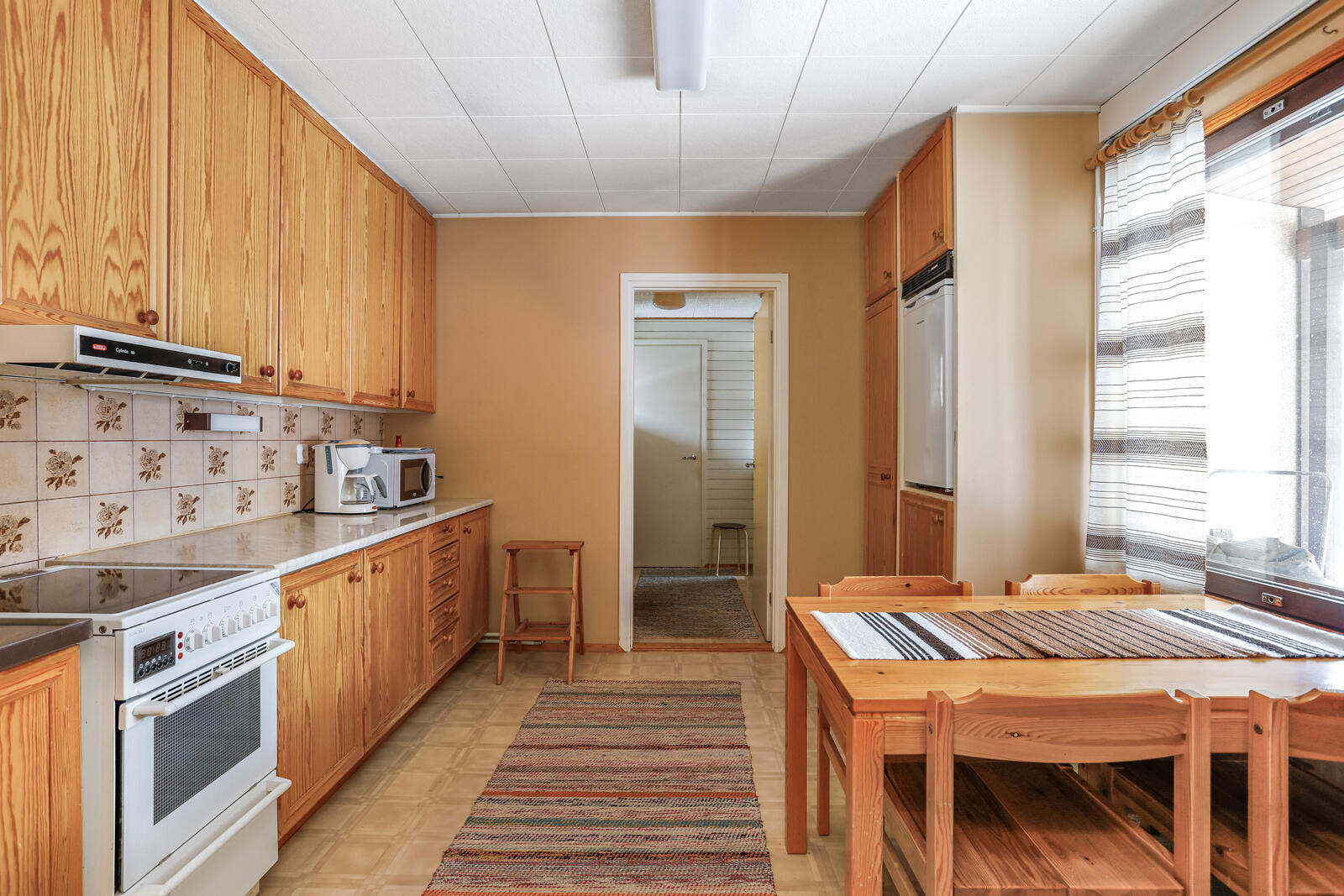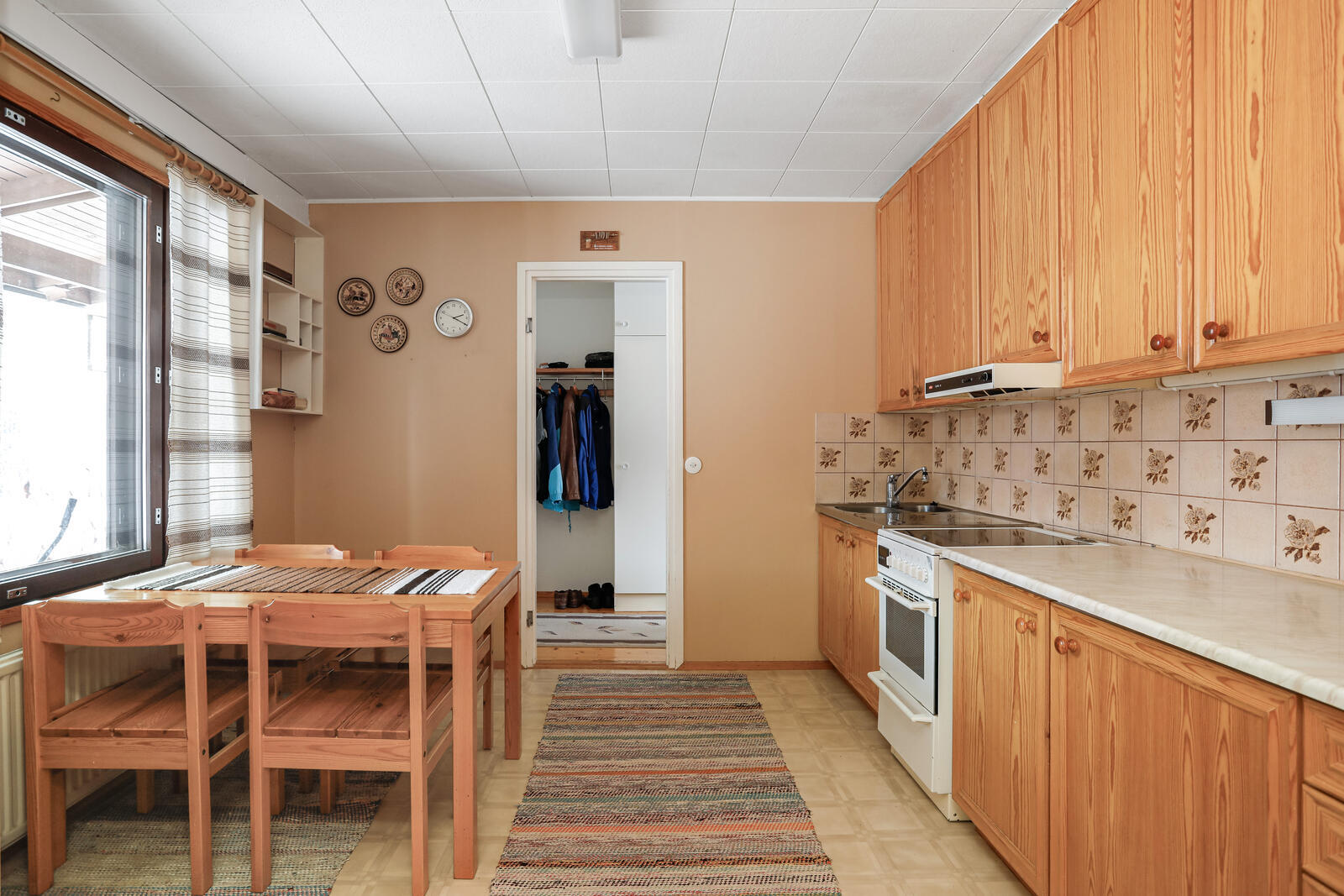 Liesi (Keraaminen liesi), seinät (laatta ja maali), lattiat (muovimatto), jääkaappi, erillinen pakastin ja varattu paikka astianpesukoneelle, kiinteät valaisimet, liesituuletin / hormi, arkkupakastin 1980-luvulta sijaitsee eteisen varastossa.