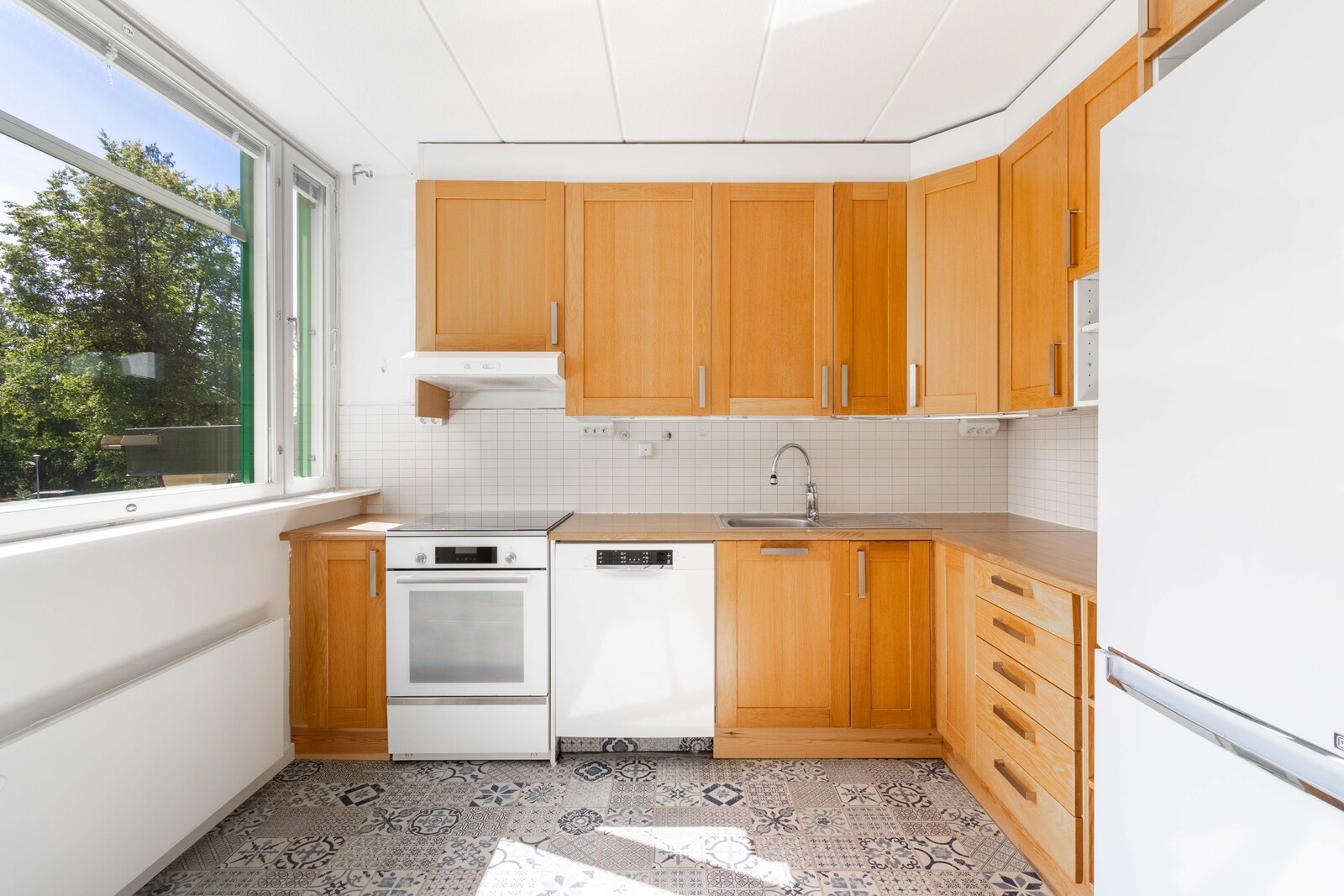 | Keittiön kuvaus | Liesi (Keraaminen liesi), työtasot (laminaatti), seinät (laatta ja maali), lattiat (muovimatto ja vinyyli), astianpesukone, jääkaappipakastin ja liesituuletin |