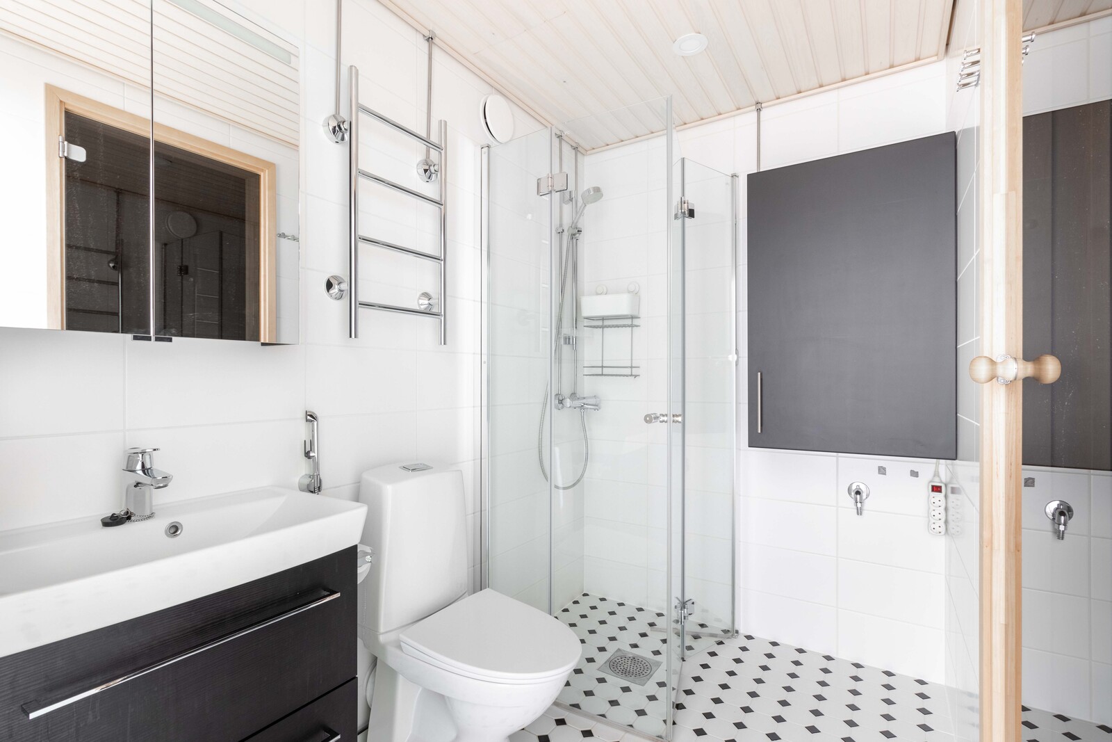 | Kylpyhuoneen kuvaus | Lattialämmitys, peili, suihkuseinä, suihku, wc-istuin ja pesukoneliitäntä, seinät (kaakeli), lattiat (laatta) |