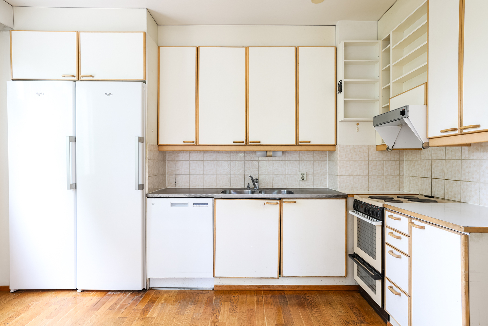 | Keittiön kuvaus | Liesi (sähköliesi), työtasot (laminaatti), seinät (maali), lattiat (parketti), astianpesukone, jääkaappipakastin ja liesi |