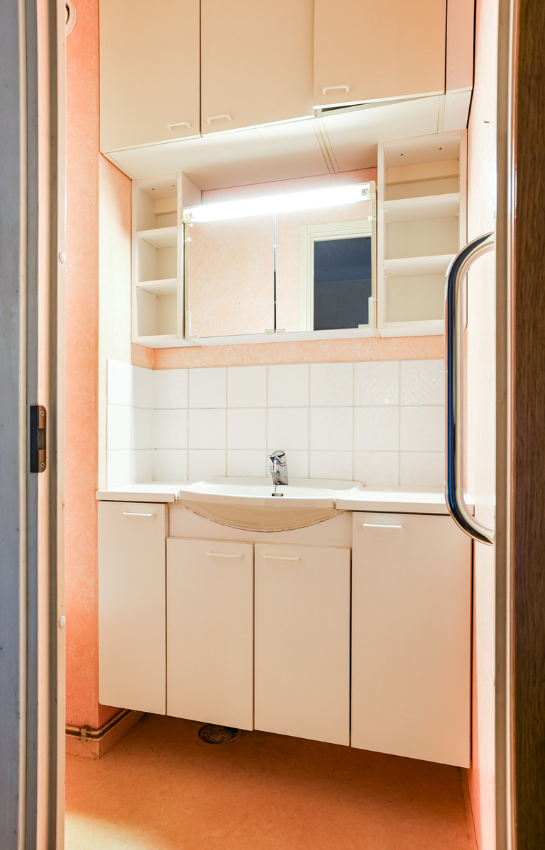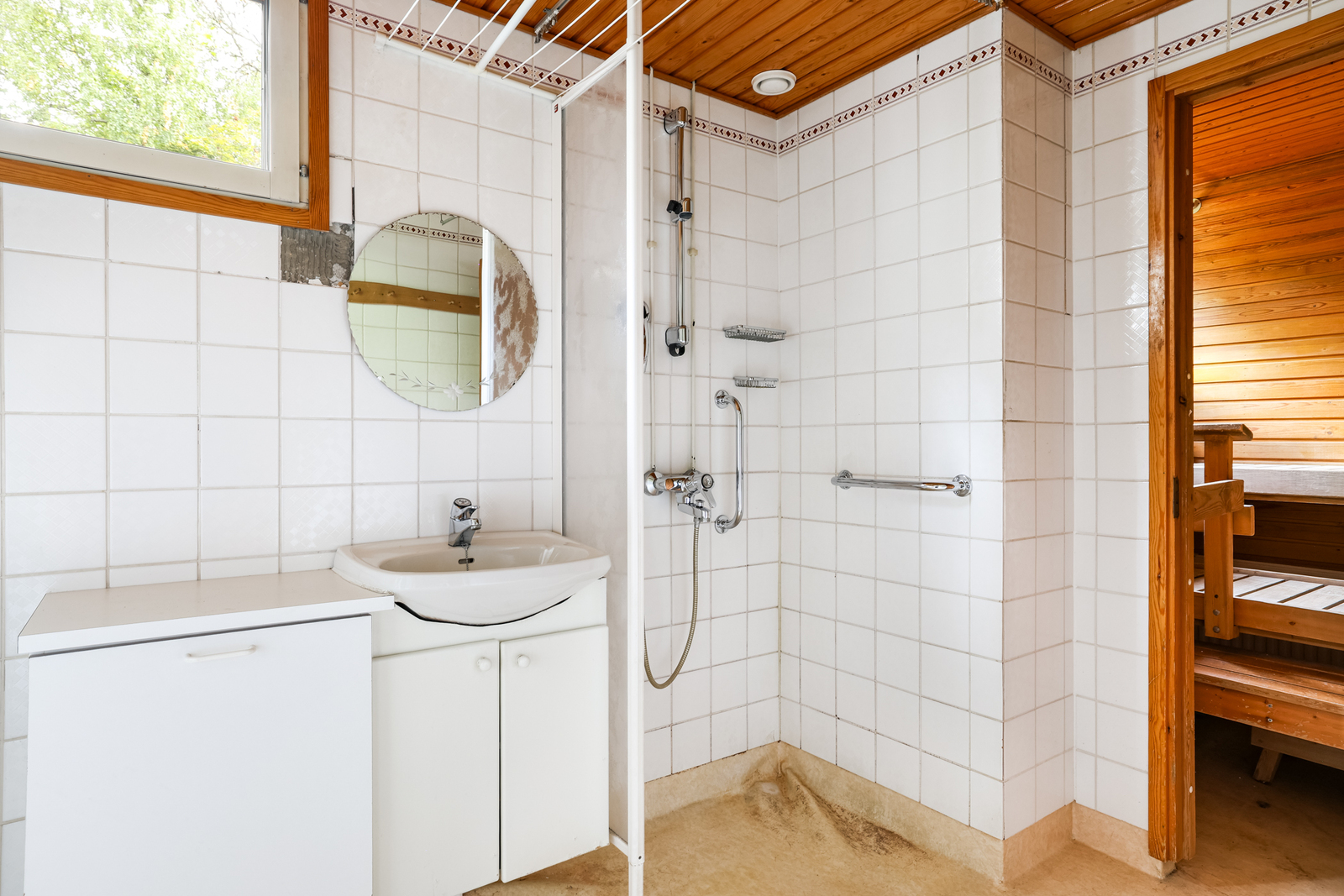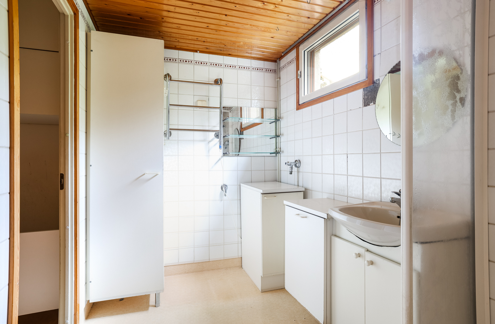 | Kylpyhuoneen kuvaus | Pesukoneliitäntä, suihkuseinä, peili ja suihku, seinät (kaakeli), lattiat (muovimatto) |