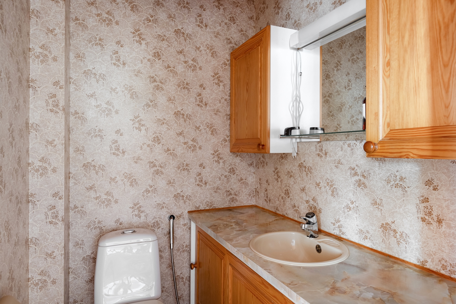 | Kylpyhuoneen kuvaus | Suihku, pesukoneliitäntä, lattialämmitys ja suihkukaappi, seinät (kaakeli), lattiat (laatta) |