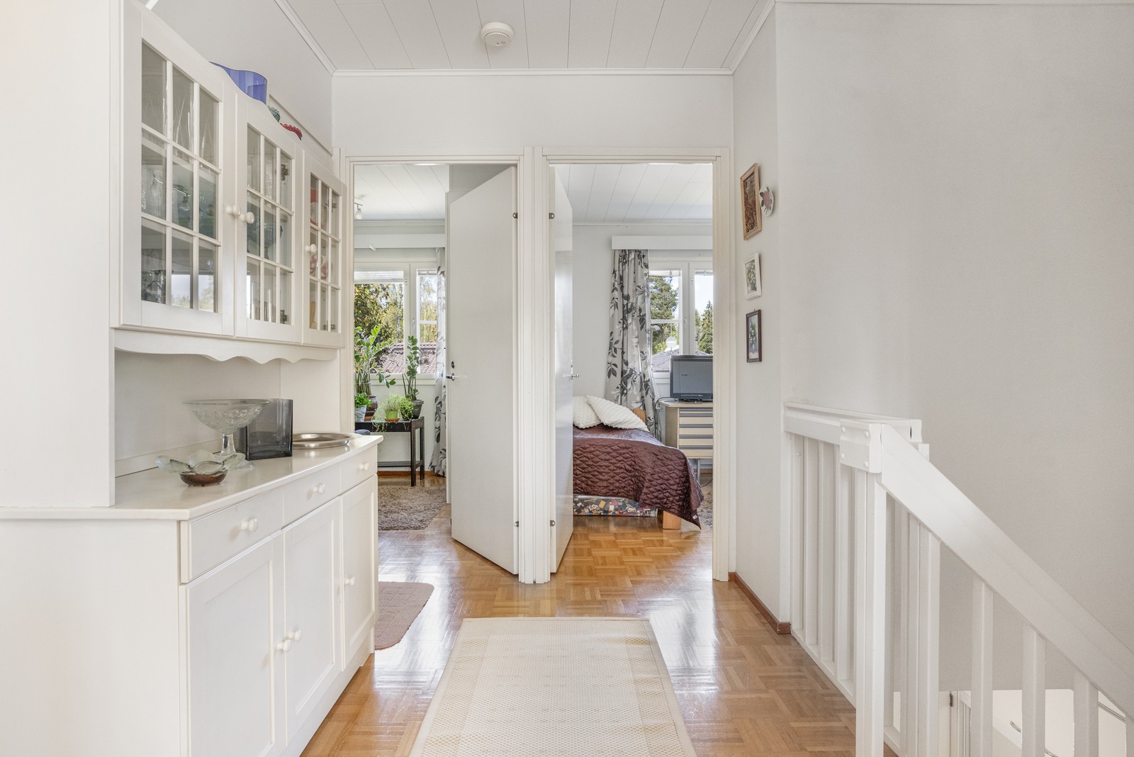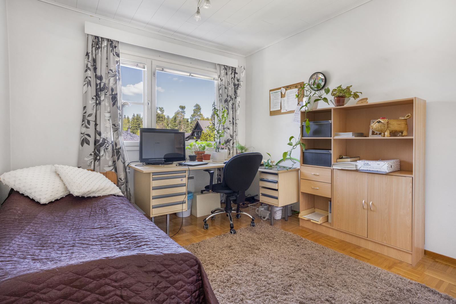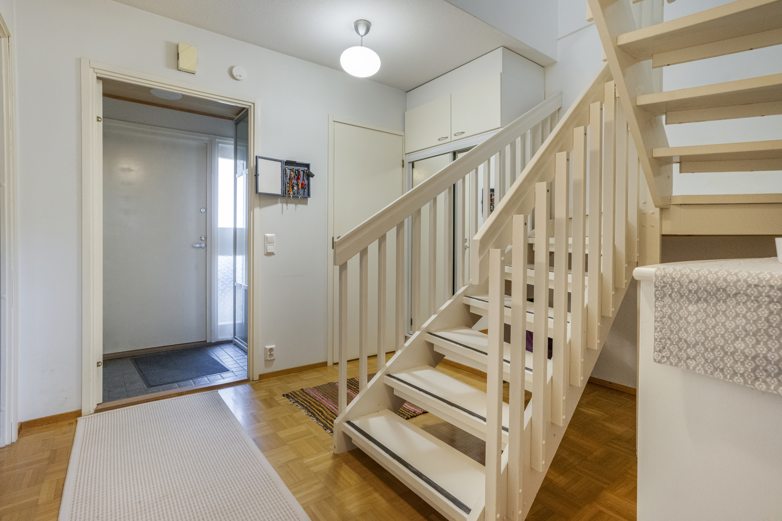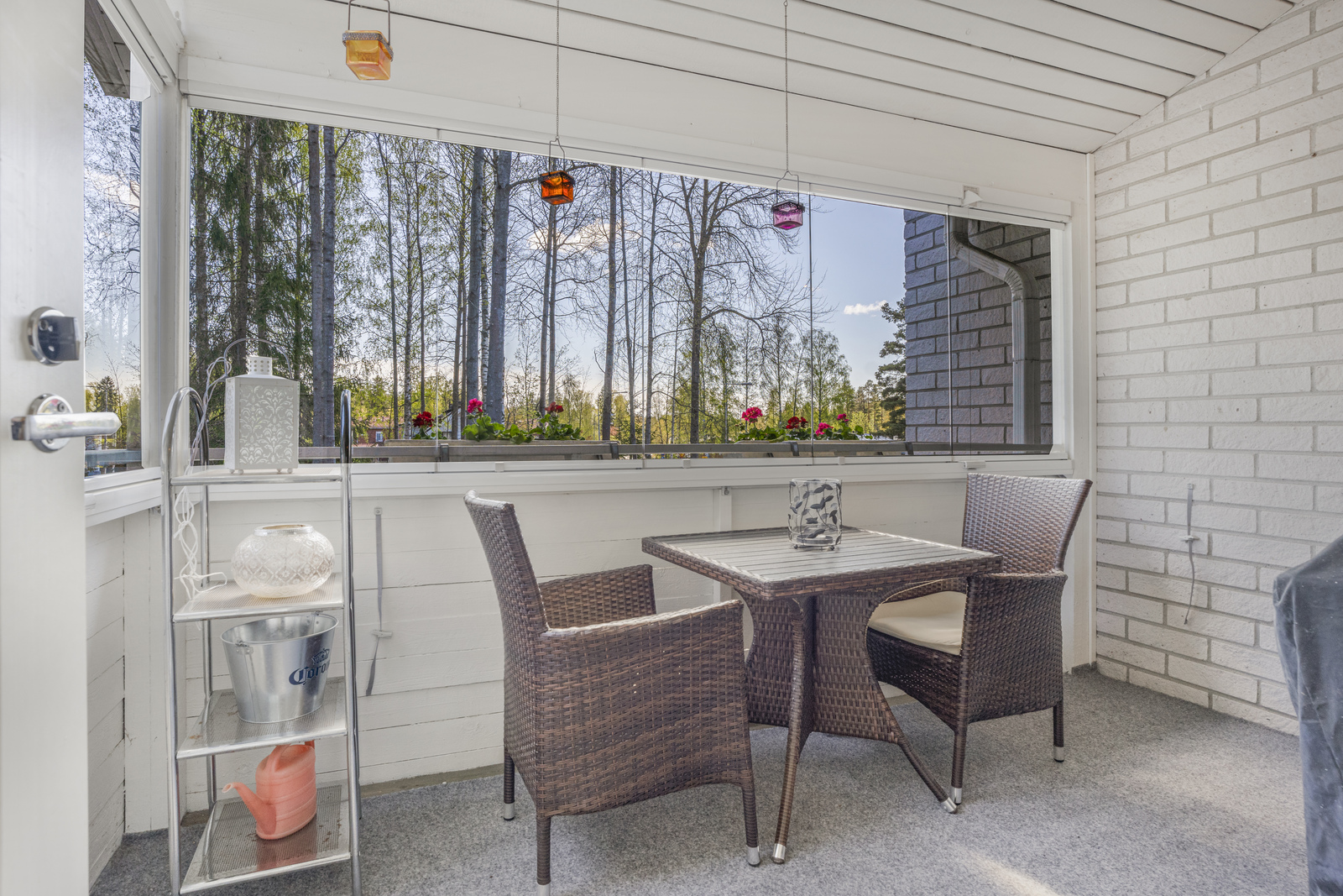 Huoneistossa on kolme makuuhuonetta, keittiö, se ihana takkahuone (jossa varaava takka) kodinhoitohuone, kaksi wc:tä sekä v.2012 remontoitu kylpyhuone saunalla. Kodinhoitohuoneen kautta on käynti suojaisalle pihalle, joka rajoittuu puistoalueeseen. Lisäksi yläkerrassa on lasitettu parveke, jolta samaan suuntaan avautuvat ihanat metsäiset näkymät.