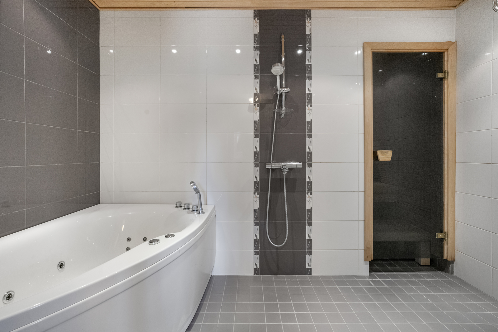 | Kylpyhuoneen kuvaus | Peilikaappi, poreamme ja suihku, seinät (kaakeli), lattiat (laatta) |