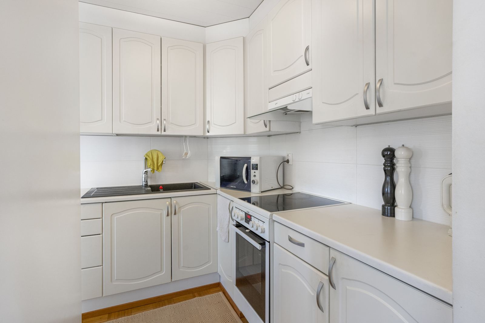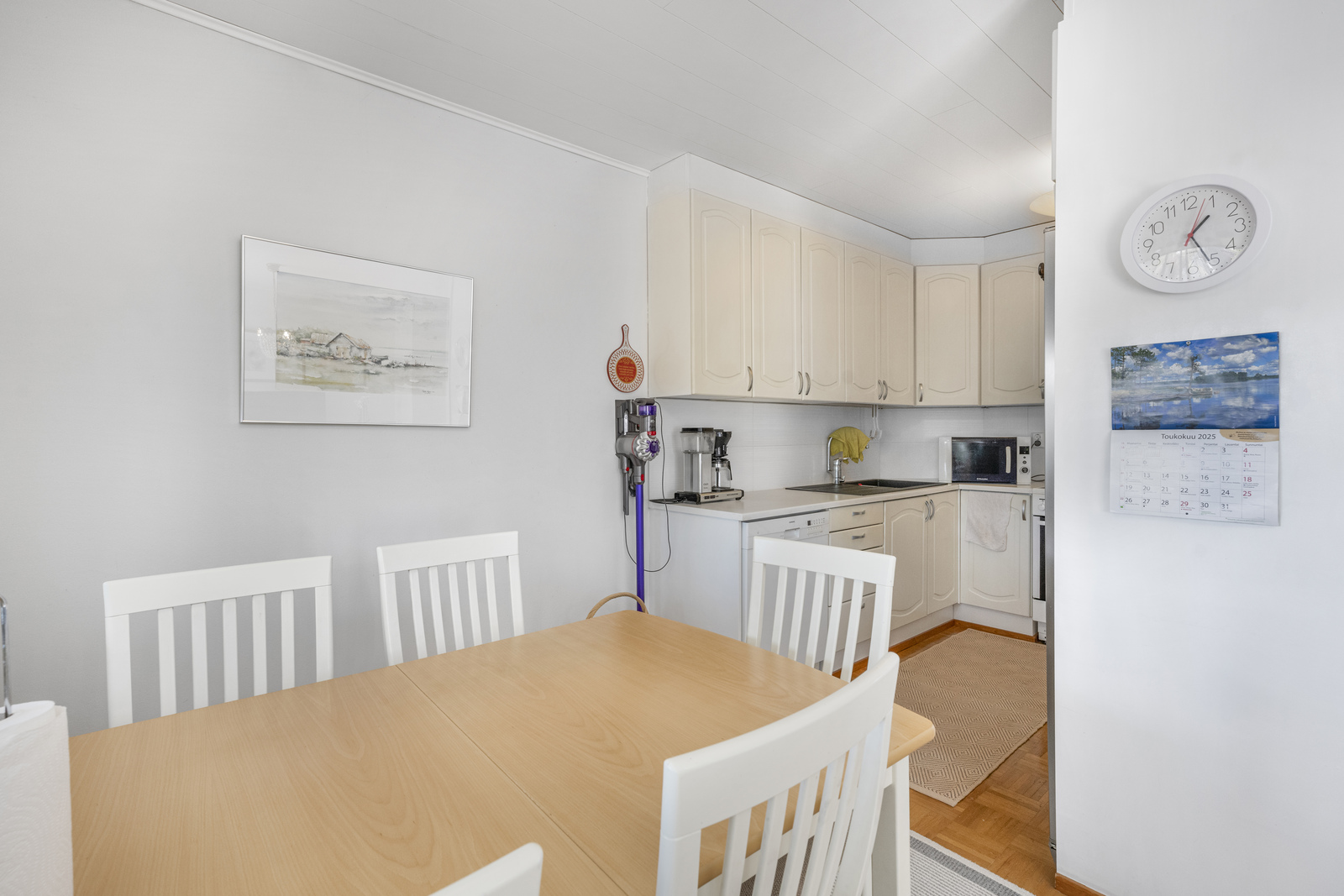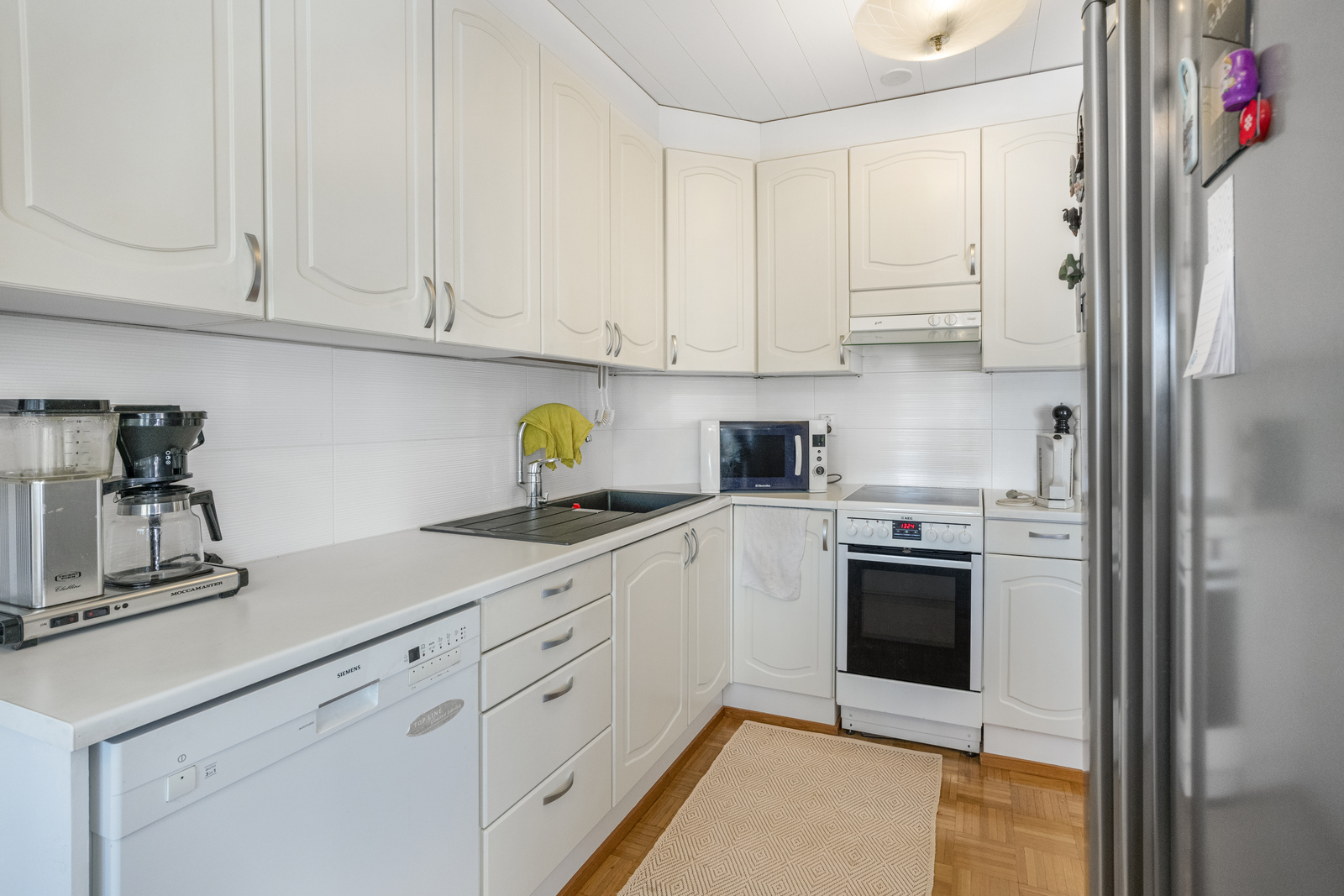 | Keittiön kuvaus | Liesi (Induktioliesi), työtasot (laminaatti), seinät (maali ja osalaatoitus), lattiat (parketti), jääkaappi, liesi, erillinen pakastin, liesituuletin ja astianpesukone |